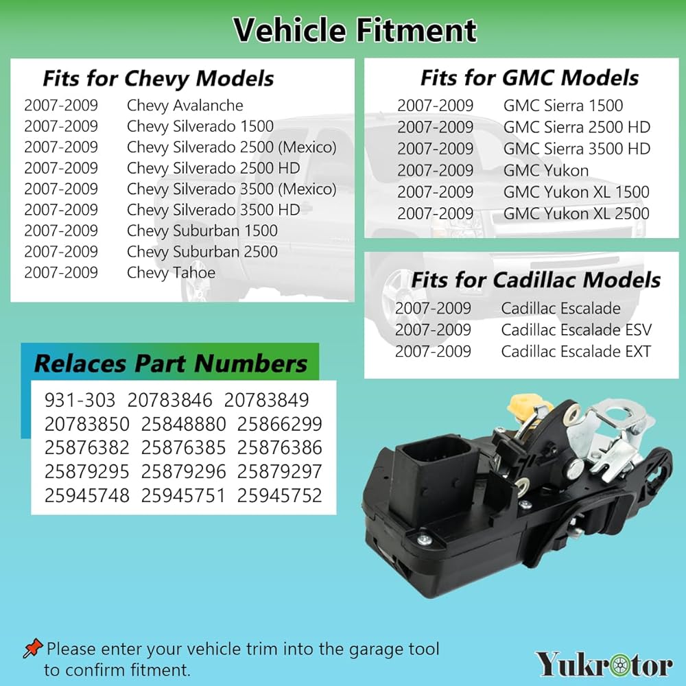 تركيب السيارة 3: محرك قفل الباب هذا متوافق مع موديلات جي إم سي: 2007-2009 جي إم سي سييرا 1500، 2007-2009 جي إم سي سييرا 2500 HD، 2007-2009 جي إم سي سييرا 3500 HD، 2007-2009 جي إم سي يوكون، 2007-2009 جي إم سي يوكون XL 1500، 2007-2009 جي إم سي يوكون XL 2500.