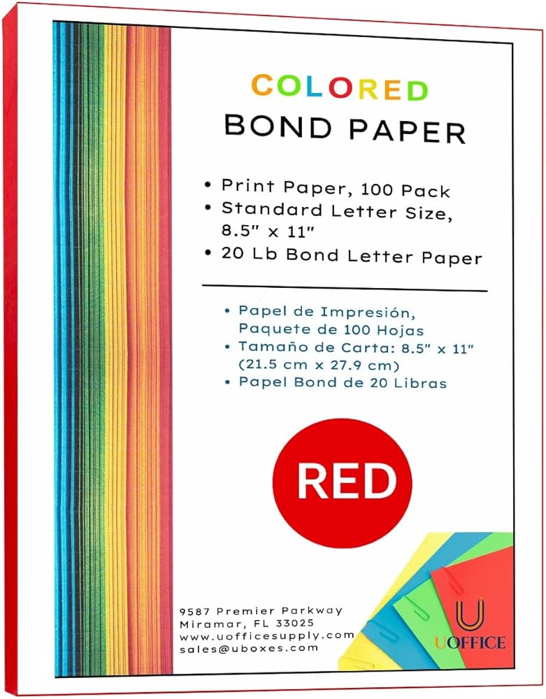 حزمة ورق سندات ملونة من UOFFICE مقاس 8.5 بوصة × 11 بوصة، 20 رطل، 100 صفحة (أحمر)