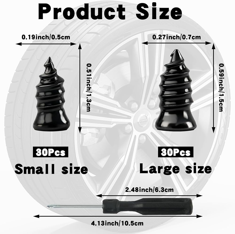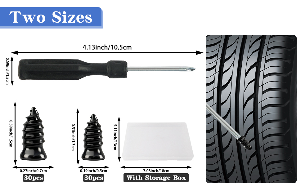 الحجم: تأتي المجموعة بحجمين من مسامير الإطارات. الأظافر الصغيرة: 11.7 × 5.3 ملم، الأظافر الكبيرة: 12.7 × 6.8 ملم. حجمان من مسامير الإطارات مناسبان لمعظم الإطارات وهما أدوات أساسية لإصلاح الإطارات.