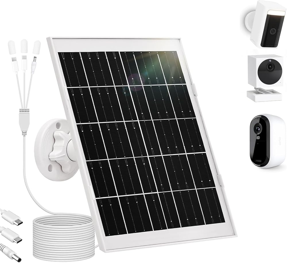 【لوحة شمسية Wyze وشاحن Arlo بالطاقة الشمسية】- لوحة شمسية خارجية بقدرة 8 واط لكاميرا Wyze Cam (كاميرا البطارية Pro، V1/V2 الخارجية) وArlo Essential (2K Outdoor 2nd Gen، Essential XL 2nd Gen، Essential Spotlight)، تتميز بمنافذ إخراج ثلاثية (Micro USB/USB-C/DC) لتشغيل Ring وEufy وأي كاميرات أمان 5 فولت. لا تقم أبدًا بتغيير بطاريات Wyze أو Arlo مرة أخرى