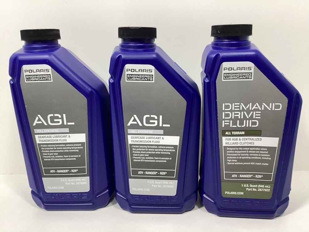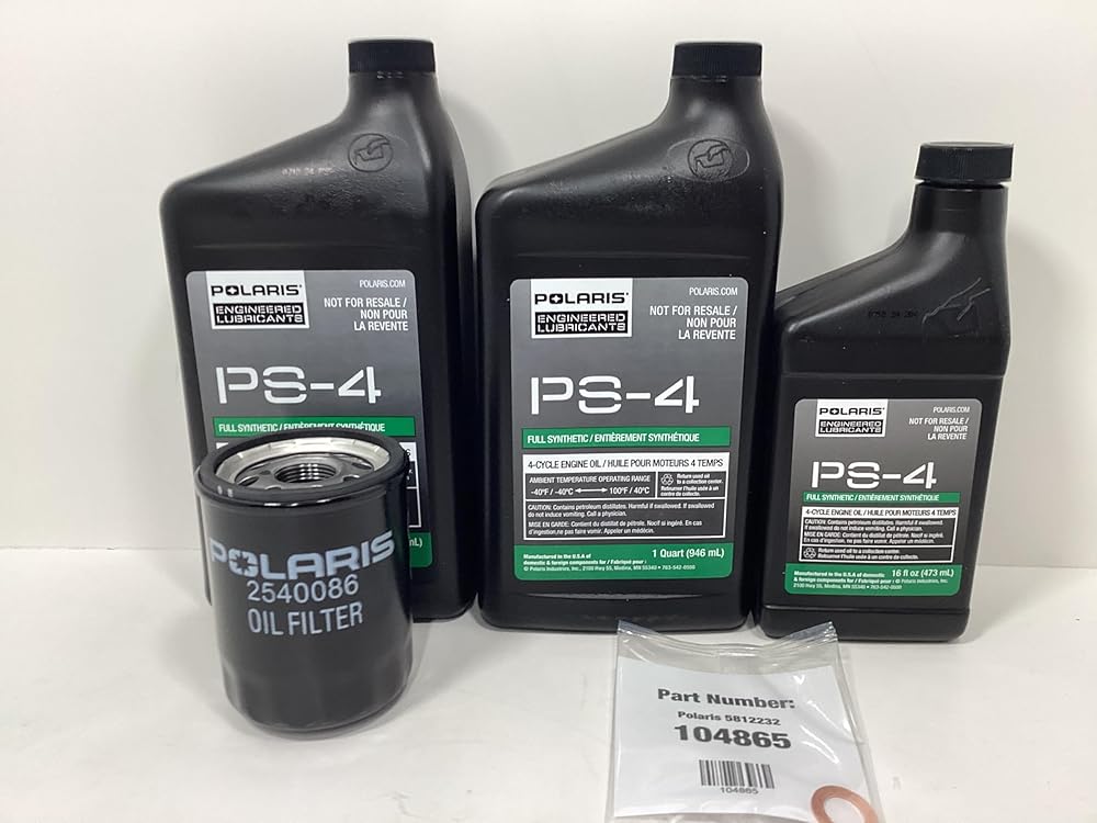 - Oil Change Kit # 2879323 with 2.5 qts full synthetic oil, filter, and drain washer - Air Filter 7081706 - NGK spark plugs MR7F - Demand Drive front differential oil - AGL Gearcase oil - 5 plastic fender rivets - Ranger 900 takes 2.5 qts engine oil, 9 oz DD front diff oil, 42 oz AGL transmission oil
