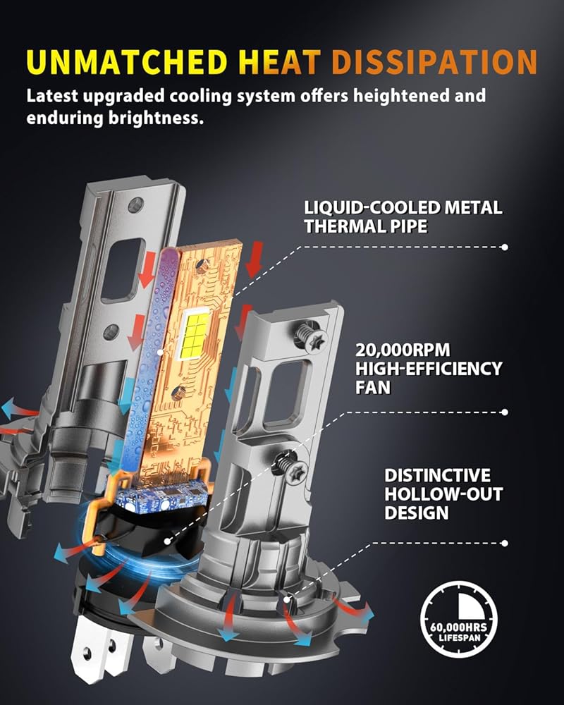 مصممة لتدوم طويلاً: مصنوعة من مواد قوية، تتحمل مصابيح H7 Powersports هذه الظروف القاسية. مقاوم للماء، ومزود بمروحة، ومجهز بنظام تبريد متطور لمنع ارتفاع درجة الحرارة، مما يضمن طول العمر والأداء المتسق.