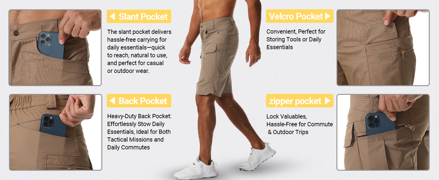 【تصميم متعدد الجيوب】تتميز شورتات العمل الرجالية لدينا بجيوب كارجو متعددة، بما في ذلك جيوب الساق الجانبية ذات القلاب، وجيوب اليد الأمامية، والجيوب الخلفية. إنها تحمل ضرورياتك بشكل آمن مثل الهاتف والمحفظة والمفاتيح والأدوات، مما يجعلها مثالية للمشي لمسافات طويلة والعمل وجميع أنشطتك الخارجية.