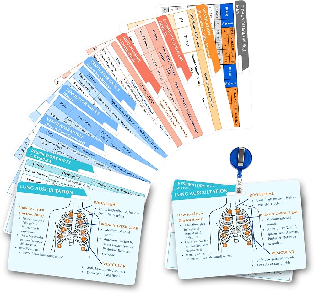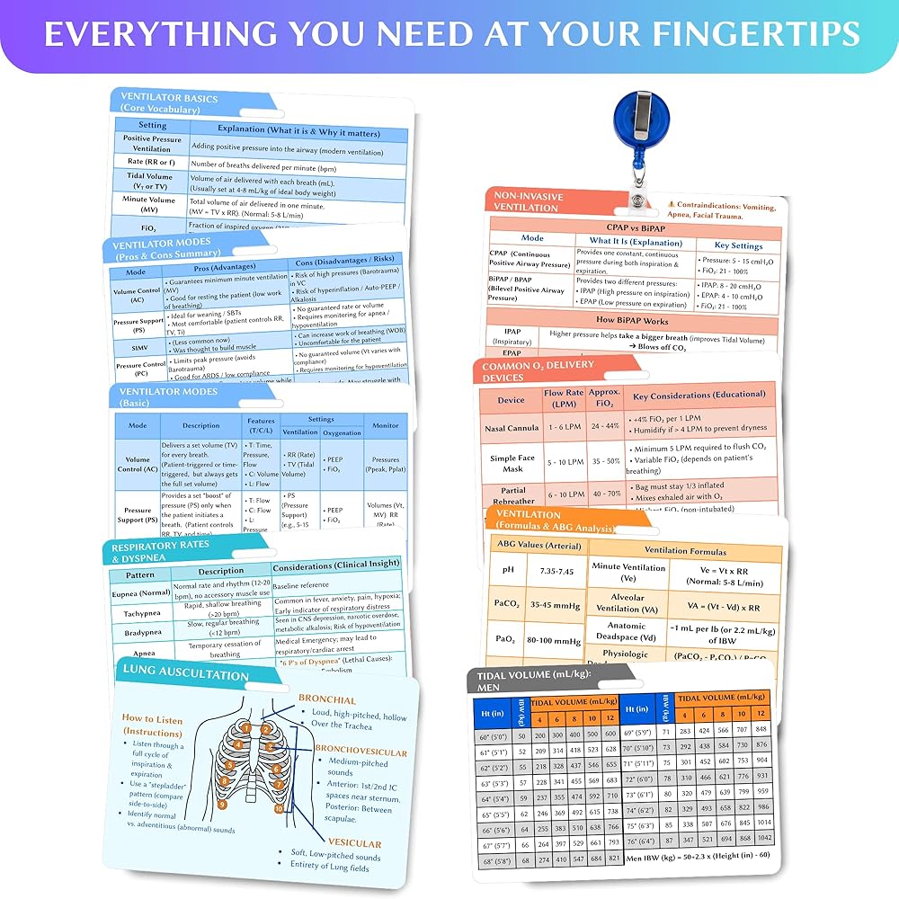 Complete 9-Card Set + Reel - Includes 18 sides of critical data plus a matching badge reel respiratory therapist clip. The ultimate respiratory therapist gift for students, grads, or colleagues during Respiratory Care Week. A comprehensive toolkit ready to use instantly.