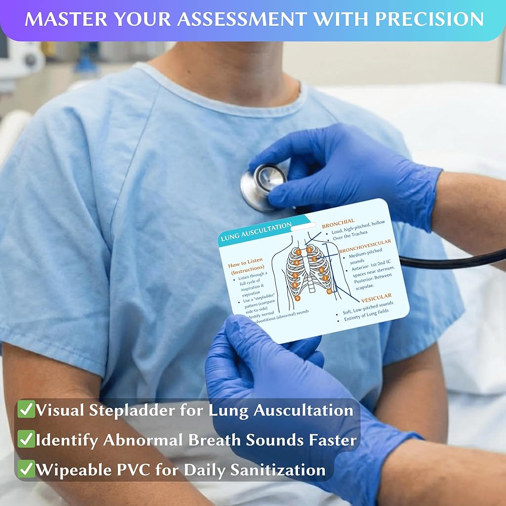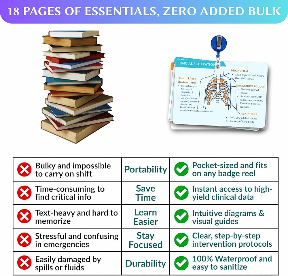 From Classroom Theory to Clinical Precision: We understand the pressure of the ICU. When alarms are ringing and patients need immediate care, even the brightest students experience "brain fog." Design your uniform for success with this ultimate rt badge buddy. This isn't just a reference card; it serves as your cognitive safety net, bridging the gap between textbook theory and real-world application, ensuring you perform with confidence from Day 1. Mobile Knowledge Base (Reel Included): Engineered to hang neatly alongside your ID, we include a matching respiratory therapist badge reel so you are ready to go right out of the box. We condensed heavy textbooks into 9 waterproof, heavy-duty PVC cards (18 sides). The optimized 10x7cm layout ensures data is easy to read without adding bulk. From deciphering complex Adventitious Breath Sounds to calculating Ventilator Modes and ABGs, you have gold-standard data at your fingertips. The Gift of Confidence: Searching for meaningful respiratory therapist gifts? Forget generic mugs. Whether you are looking for respiratory therapy student essentials for a new graduate, or a token of appreciation for Respiratory Care Week, this set delivers daily value. Equip yourself or your favorite RT with the respiratory therapist accessories they need to make accurate decisions when it counts most.