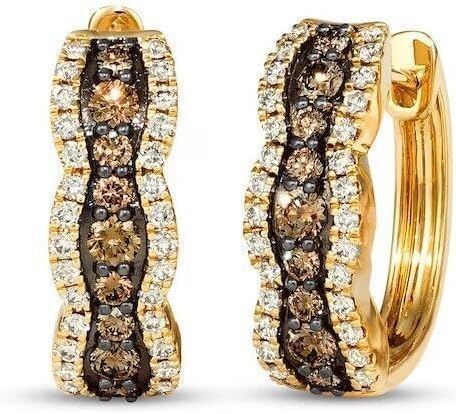 Add a touch of sophisticated glamour to your jewelry collection with these stunning huggie hoop earrings. Featuring an intricate design of alternating brown and white diamonds totaling approximately 2 carats, these earrings create a mesmerizing wave-like pattern. The 925 sterling silver base with 14K yellow gold finish provides both durability and luxury. The huggie style ensures a secure and comfortable fit that sits close to the ear, making these earrings perfect for both special occasions and everyday wear. The contrast between the rich brown diamonds and sparkling white stones creates a unique, eye-catching effect that draws attention while maintaining elegance. These versatile earrings complement any outfit, from casual to formal, making them an essential addition to your jewelry wardrobe. The classic design with a modern twist makes these hoops a timeless piece that will remain stylish for years to come.