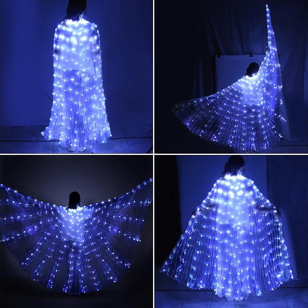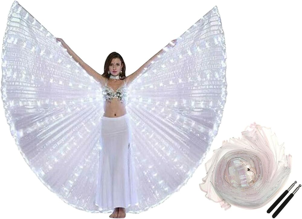 Features: PACKAGE INCLUDES: 1 x Belly Dance LED Wings , 1 x Pair telescopic sticks.This product is not suitable for children under 12 FEATURE: Self adhesive neck easy to wear and take off; The wings could be lift up over the head and 360 degrees extension;Gorgeous and elegant;Glowing LED lights make you shine even more in the crowd, making your dance more charming and attarctive. OCCASION: For Belly dance, shows,Easter,annual fancy-dress rave, carnival, stage, Halloween party, Christmas outfits, bar,photography,cosplay, etc. LED Glowing: With many LED lamp beads which has high brightness and can illuminate the entire performance area. MATERIAL: Great copper wire, stronger conductivity, anti-breakage and strong stability. Low temperature, long life, low power consumption, energy saving and high efficiency. Specifications: Material: Polyester Light Source: LED Light Color: White Gender: Women Radius: about 140 cm Battery: 3 x AA batteries(Not included) Package Included: 1 Pc x LED Wing(Stick included) Note: 1. Due to the light and screen difference, the item's color may be slightly different from the pictures. 2. Please allow 0.5-2 cm differences due to manual measurement.
