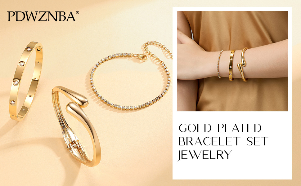 PDWZNBA Gold-plated Bracelet Set — a chic stack of gold-plated bracelet styles: Floral clover bracelet, tennis bracelet (17+3 cm), classic love bracelet (18 cm/7") and chunky adjustable twist cuff (7.5", flexible fit). Made from 316L stainless steel with 18K gold-plating and high grade stone; lead and nickel free, tarnish resistant and hypoallergenic. Wear pieces solo or layered for a modern look. Arrives gift ready — perfect as a Jewelry gift for her, bridesmaids or everyday wear.