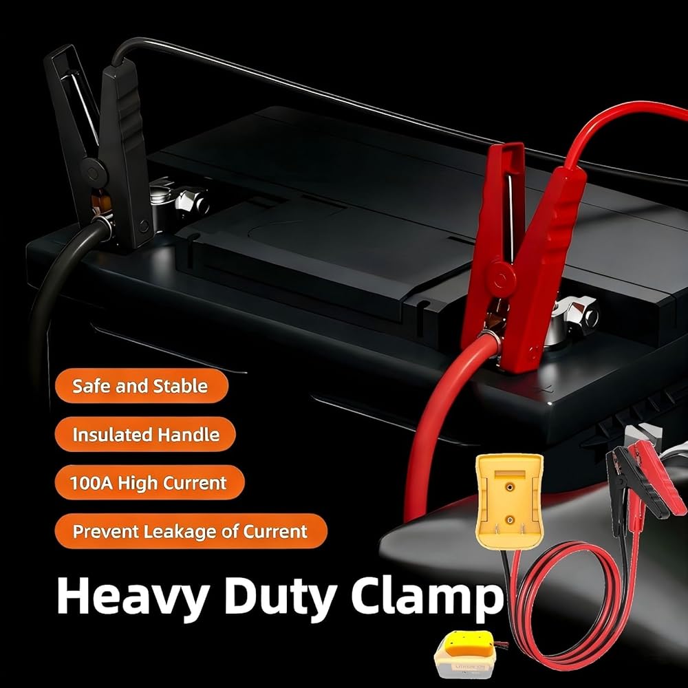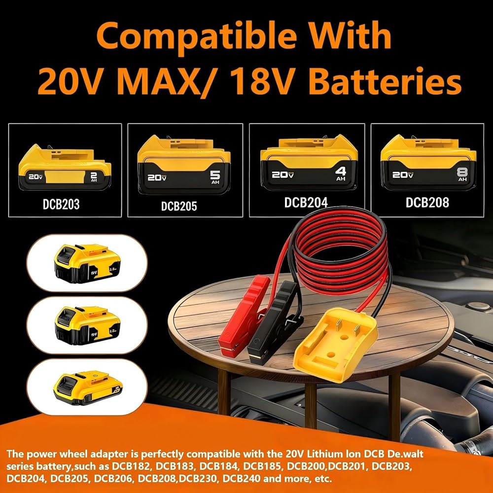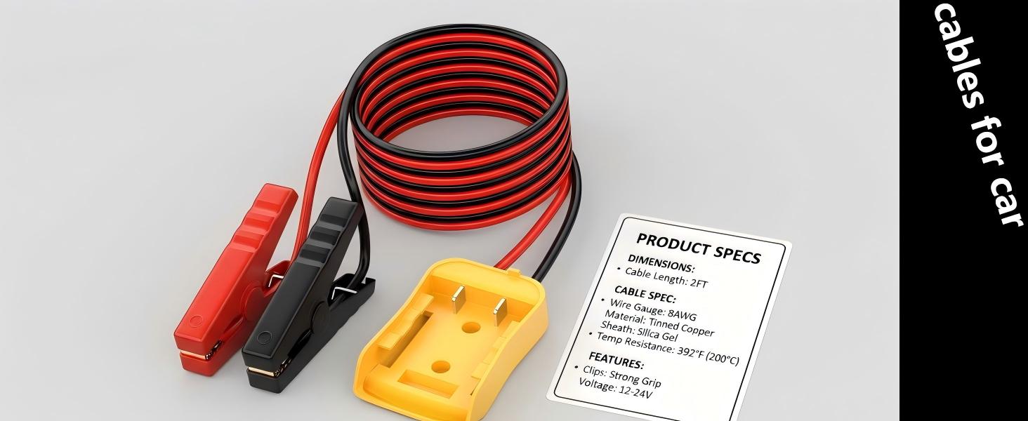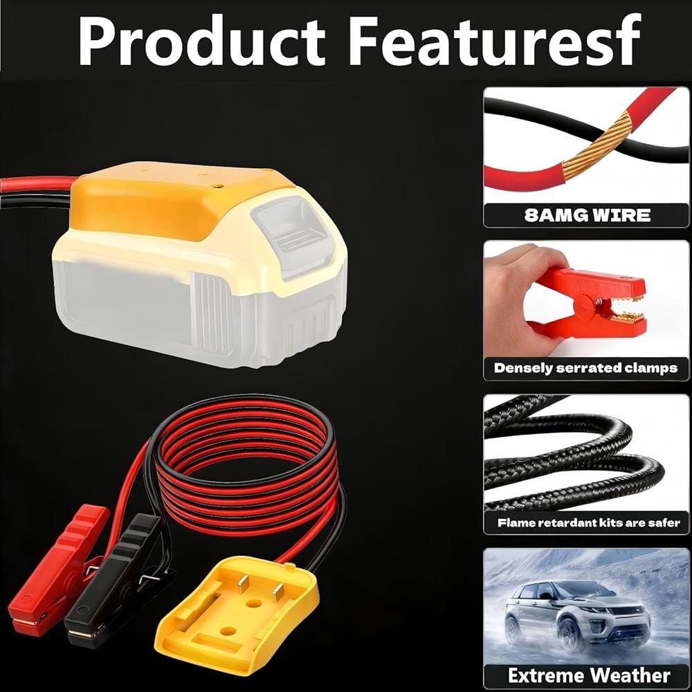 كابلات توصيل 2FT للسيارة مع محول، سلك سيليكون 8AWG مشبك التمساح، كابل توصيل السيارة، يستخدم لبدء تشغيل بطاريات السيارة أو الأدوات، متوافق مع بطاريات DE.Walt 20V.