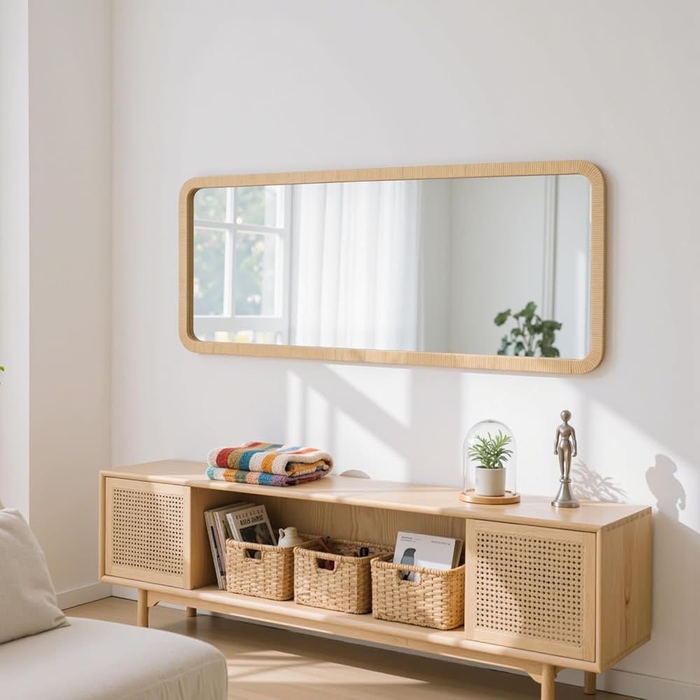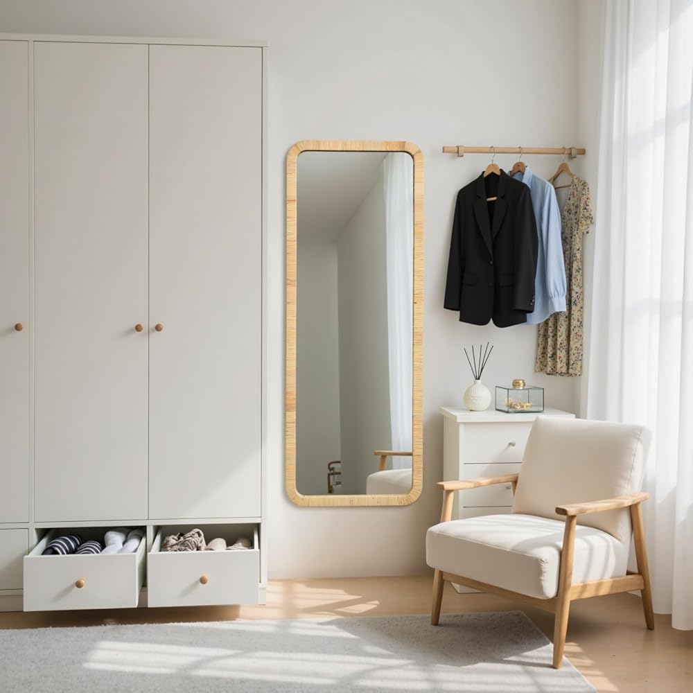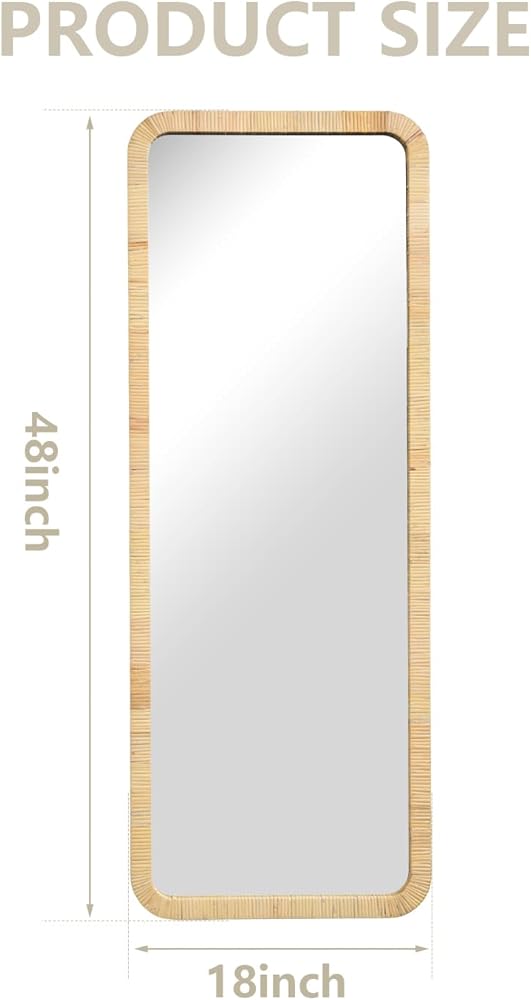 Rectangle Wicker Mirror: This farmhouse full body mirror measures 18"x48" and is made of natural solid wood frame. The smooth shape and size are full of charm.