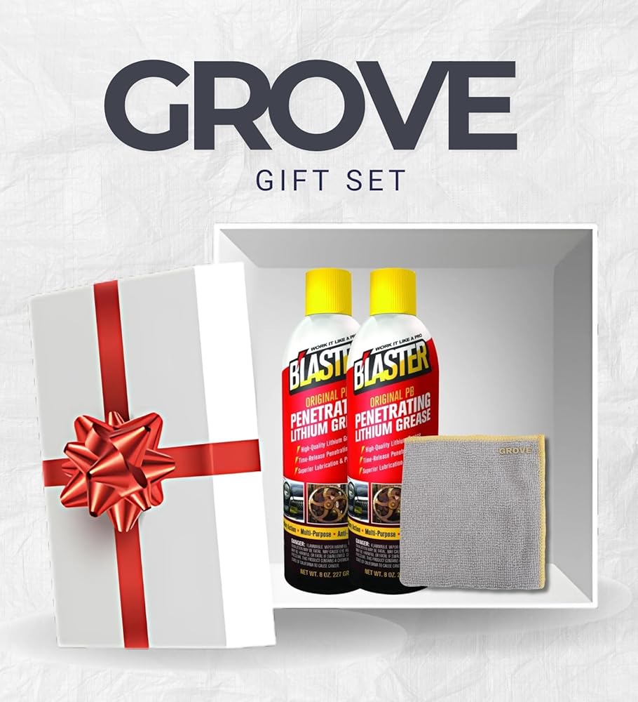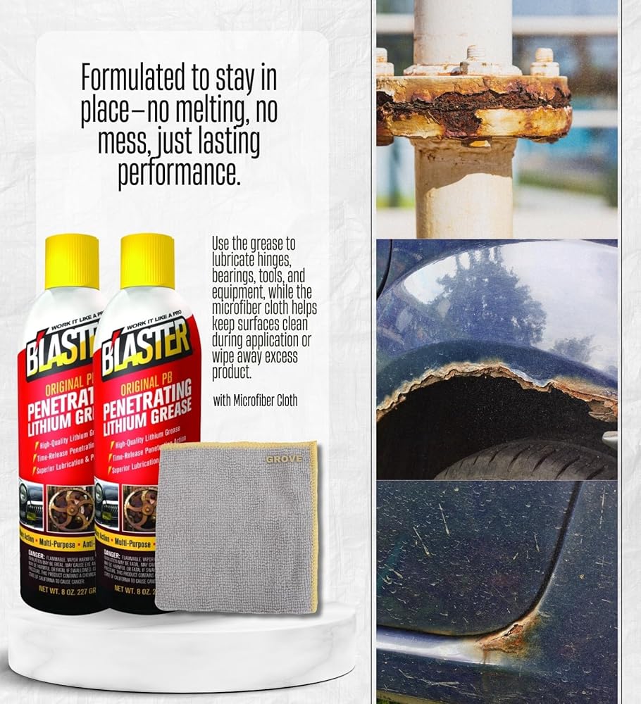 Blaster Original PB Lithium Grease combines the power of the original PB Blaster with the performance of a premium white lithium grease. This formulation delivers long-lasting lubrication through a time-release penetrating action that helps protect metal parts against rust and corrosion. The grease stays in place longer than conventional formulas, ensuring continued performance under pressure and in harsh environments. Ideal for metal-to-metal contact points, this grease can be used across a wide range of applications including garage door tracks, hinges, chains, tools, and mechanical linkages. It's especially effective on garage doors, trailers, construction equipment, farm machinery, and recreational vehicles. The formula penetrates rusted areas to loosen corrosion and prevent future damage. It also helps quiet squeaks, reduce wear, and extend the life of components exposed to moisture and friction. This gift set includes two 8 oz cans of Blaster Original PB Lithium Grease and one microfiber cloth to assist with prep and cleanup. Whether you're applying white lithium grease spray to garage doors or using it as a chain lube spray can for outdoor tools, this set is suited for routine maintenance. Keywords include garage door lubricant spray, spray grease, grasa de litio blanca, and dry lubricant spray can.