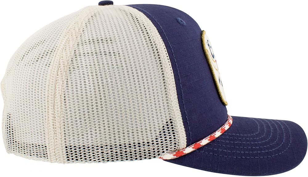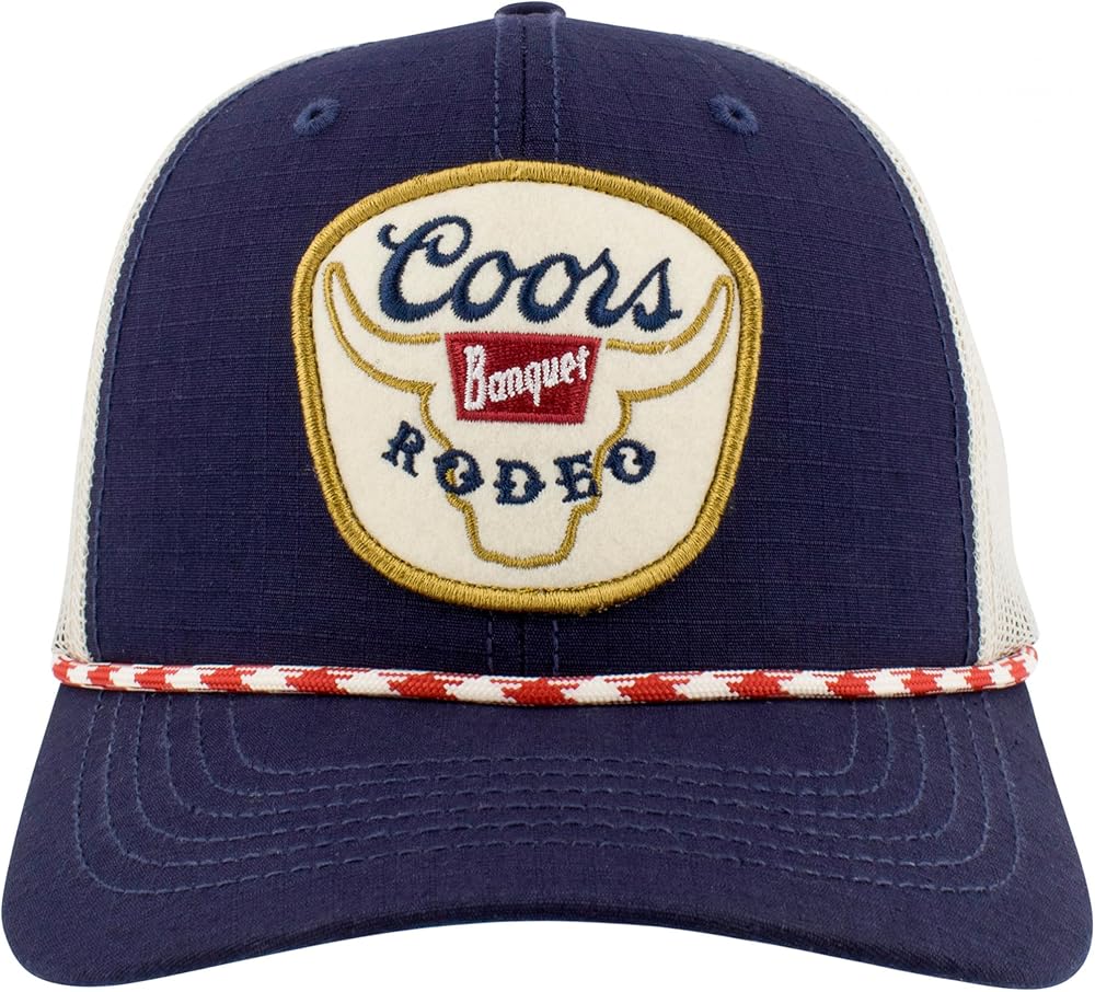Officially licensed Coors Banquet Rodeo Felt Patch Logo Rope Hat. This blue and white "Coors Banquet" Rope Hat is made from cotton and features a classic "Coors Banquet Rodeo" felt logo patch on the front with a rounded bill, corded rope, and adjustable snapback.