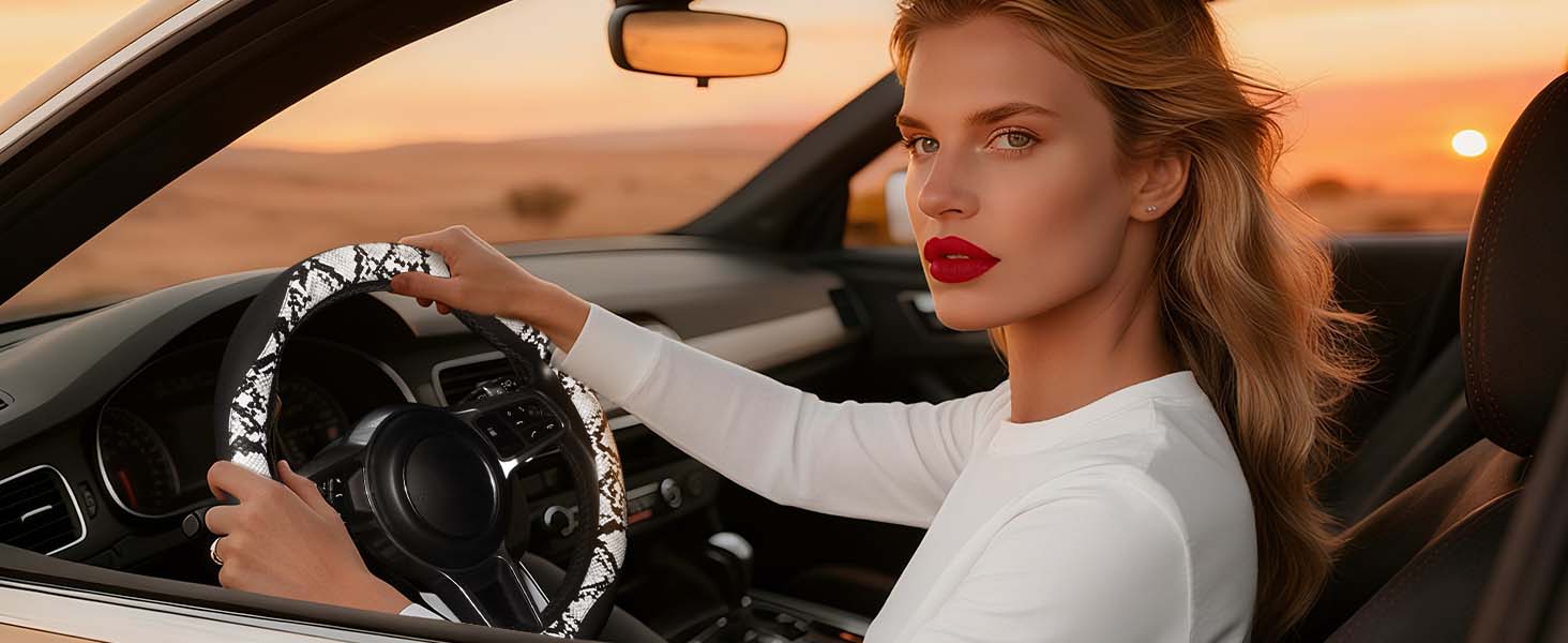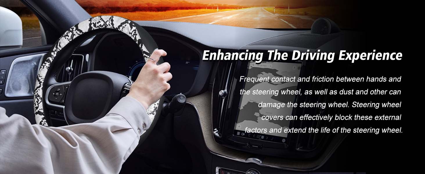 【تصميم فاخر بطباعة الأفعى】يتميز غطاء عجلة القيادة المصنوع من جلد البولي يوريثان باللونين الأبيض والأسود بطباعة الثعبان بنمط طباعة ثعبان جريء وملفت للنظر يضيف صيحات الموضة والفخامة إلى الجزء الداخلي لسيارتك. يعزز السطح الناعم والمتين من جمالية القيادة.
