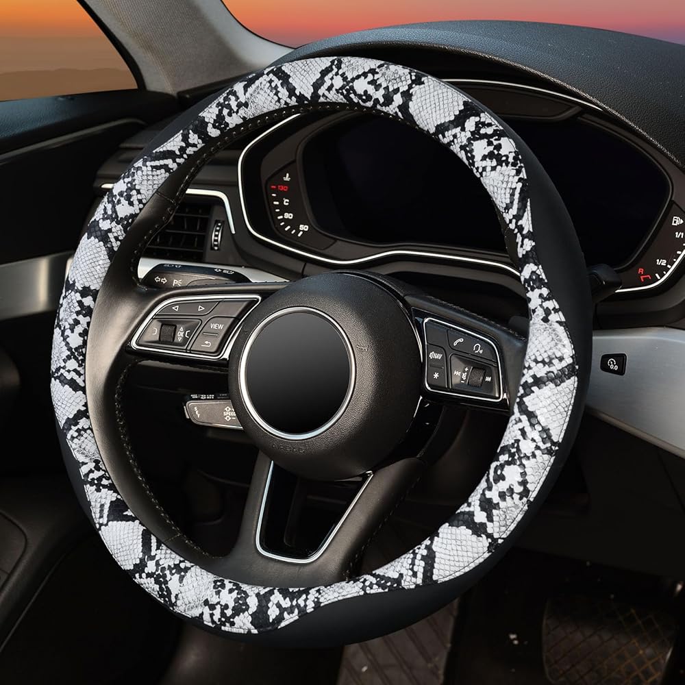 غطاء عجلة القيادة من جلد الثعبان من ZHOL، جلد من الألياف الدقيقة المسامية عالمي مقاس 14.5-15 بوصة، واقي عجلة قيادة السيارة مضاد للانزلاق للنساء والرجال، أسود وأبيض