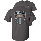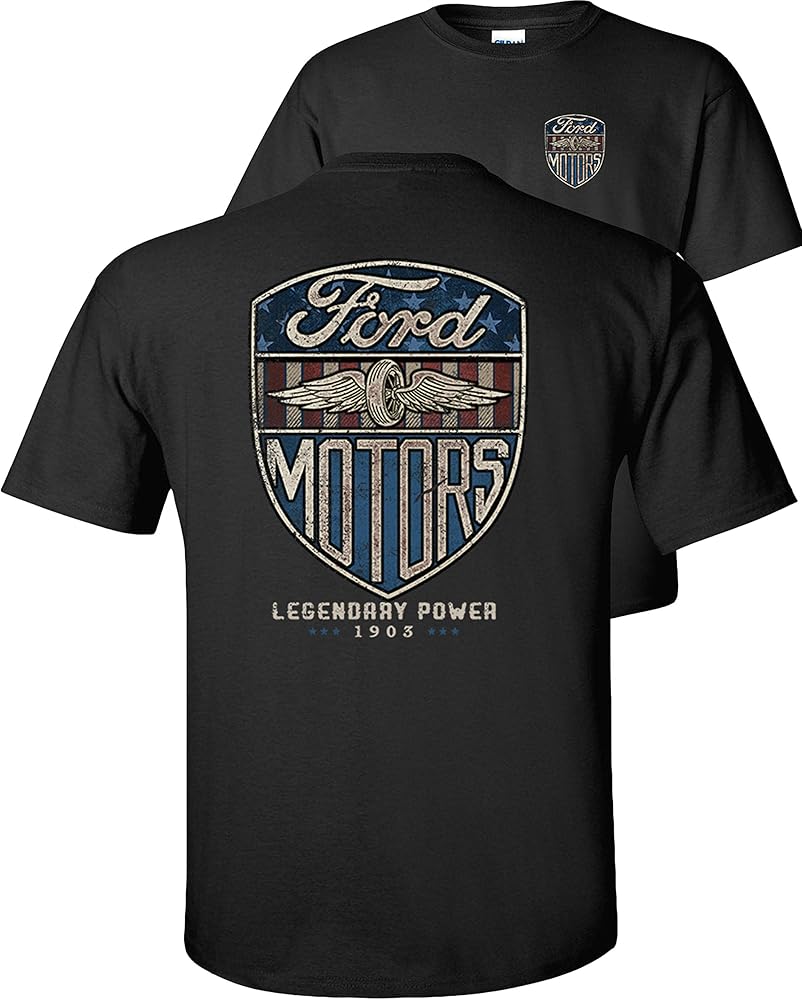 The Ford design is on the back and a small print on the front left chest. Fair Game offers an extensive lineup of Ford designs: PERFECT GIFT IDEA: For your Ford enthusiast!