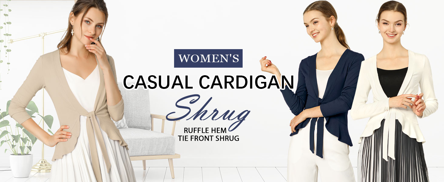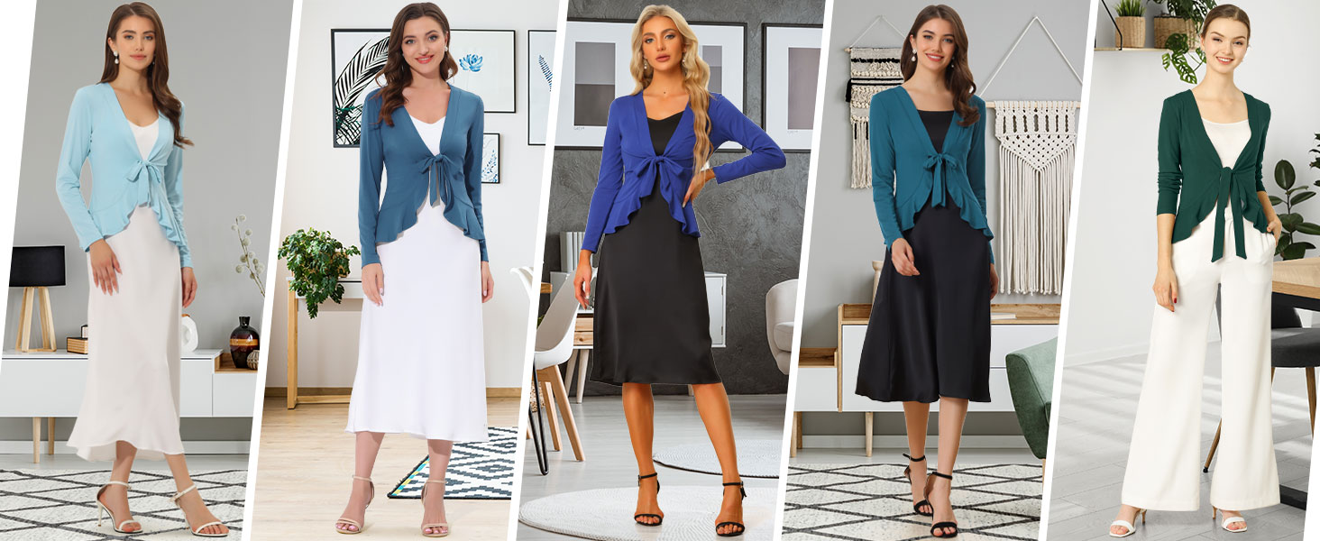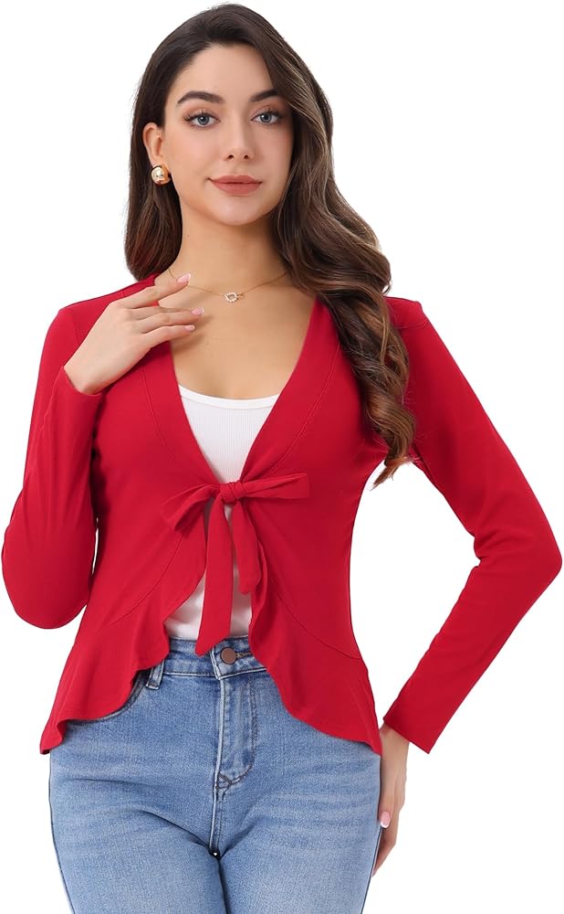 • Tie Front, Long Sleeve, Draped Ruffled, Dressy Casual, Knit Sweater, Open Front Cardigans