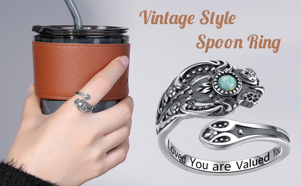 حلقة ملعقة كلاسيكية كلاسيكية مستوحاة من الملاعق العتيقة والأوبال والزهرة وبعض اللمسات العتيقة، مما يجعلها تجربة بديلة جيدة لأصابعك. حلقة عريضة فريدة قابلة للتعديل مع كلمات منقوشة أنت محبوب، أنت تقدر أنك جميلة، إنها هدية مثالية لنفسك أو لأحبابك.