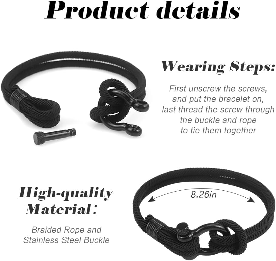 Bracelet for Teenagers: This mens bracelet is made of high quality braided rope and stainless steel buckle.The well-made nylon rope makes the bracelet strings turdy and comfortable for daily wear. The way to wear it is as follows. First unscrew the screws,and put the bracelet on, last thread the screw through the buckle and rope to tie them together. The 8.26inches length is suitable for most people's wrists. Gifts for 13 14 15 16 17 years old.