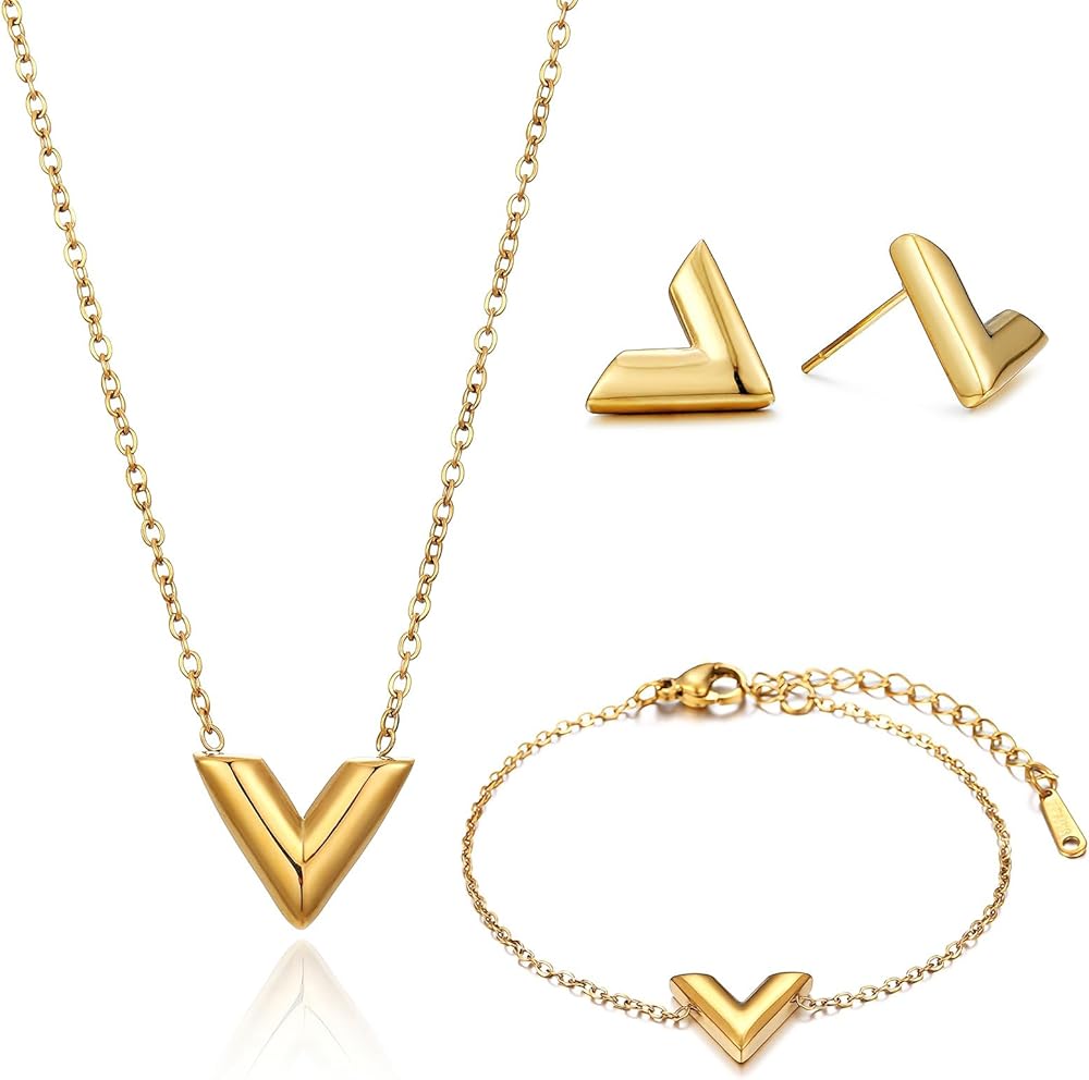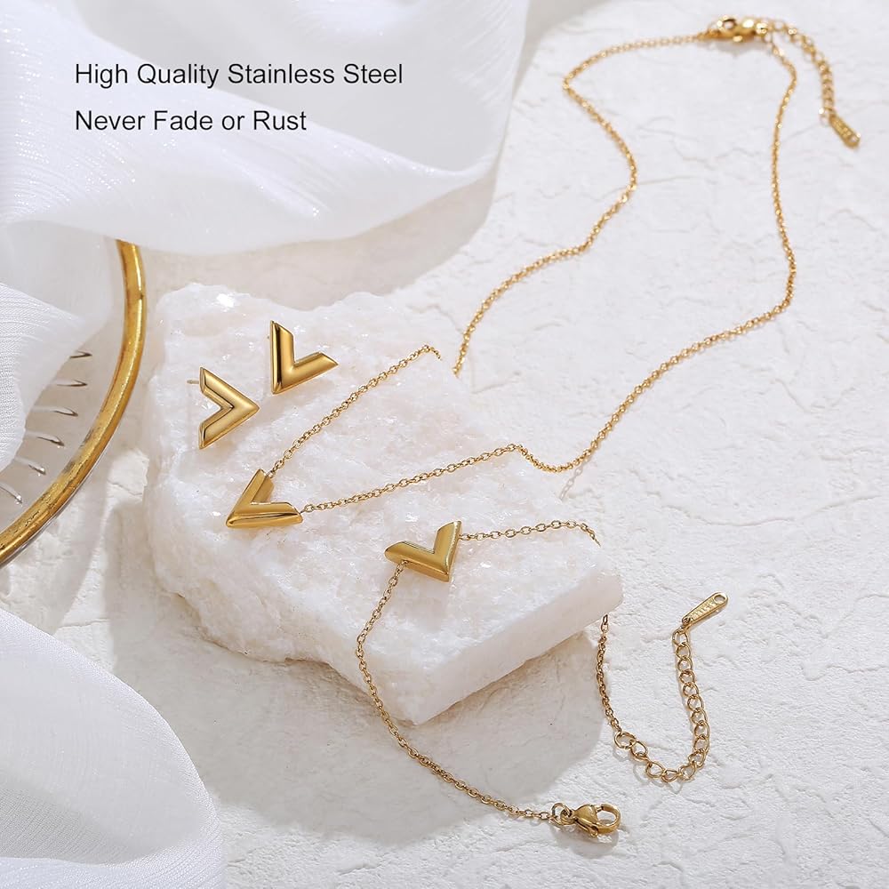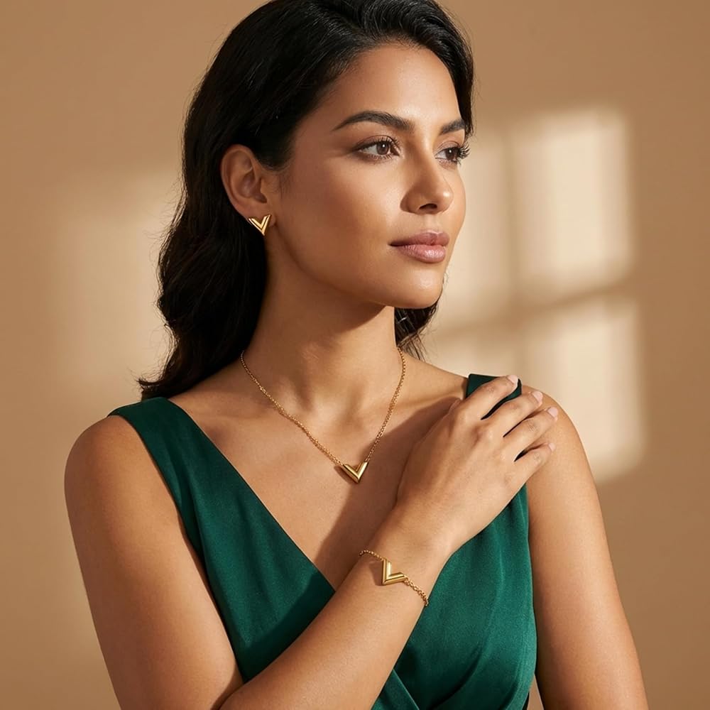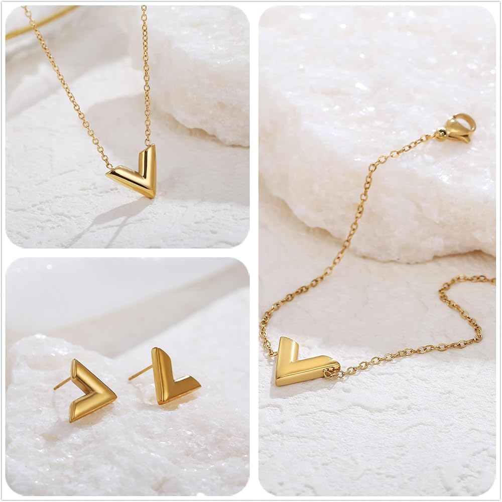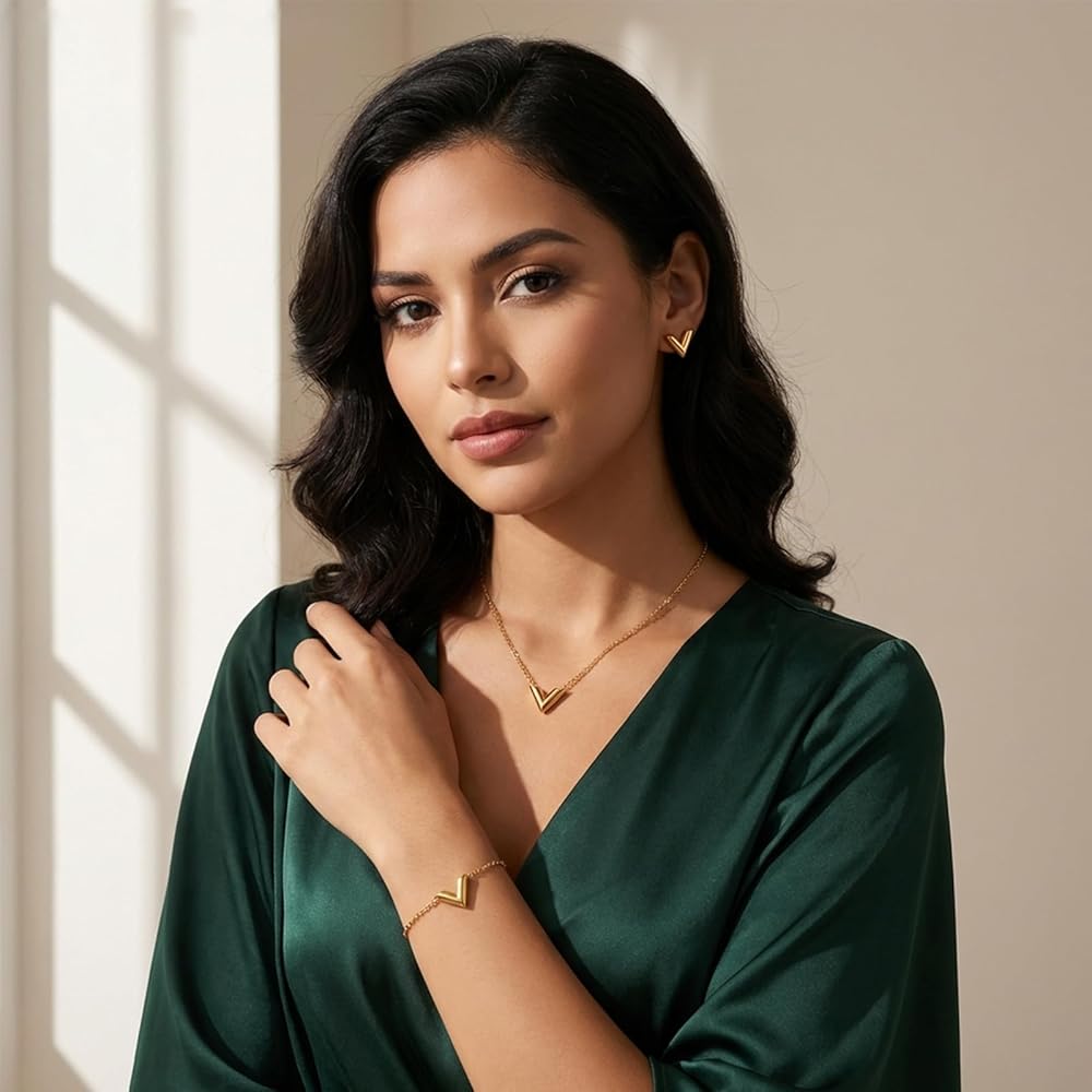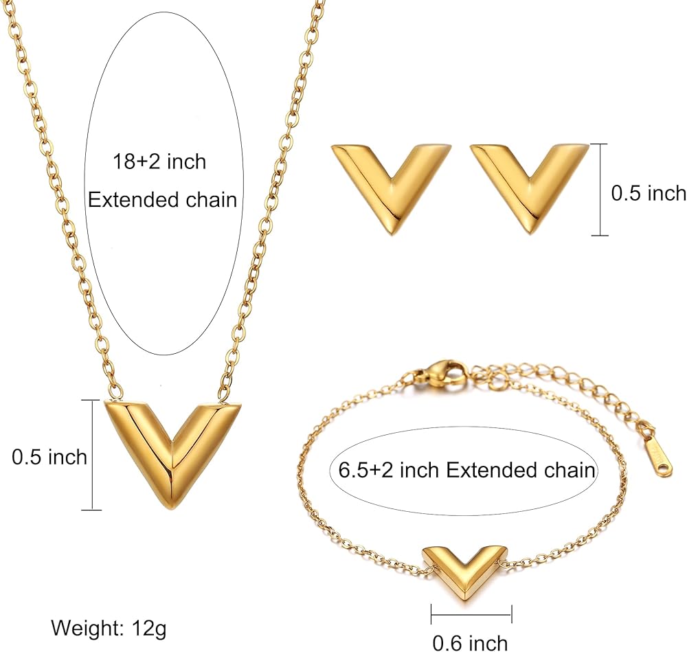 Elevate your everyday style with this 18K Gold Plated Letter V 3-Piece Jewelry Set—crafted from tarnish-free, lead & nickel free stainless steel for sensitive skin. Features an 16+2” adjustable necklace, flexible bracelet, and polished stud earrings with a sleek V pendant design. Hypoallergenic, fade-proof, and lightweight for all-day comfort, it's perfect for daily wear, work, dates or special events. Wear as a full set or mix & match for versatile styling. Packaged in a velvet gift bag, with 30-Day Return & 12-Month Warranty—an ideal gift for birthdays, Mother's Day, anniversaries and holidays