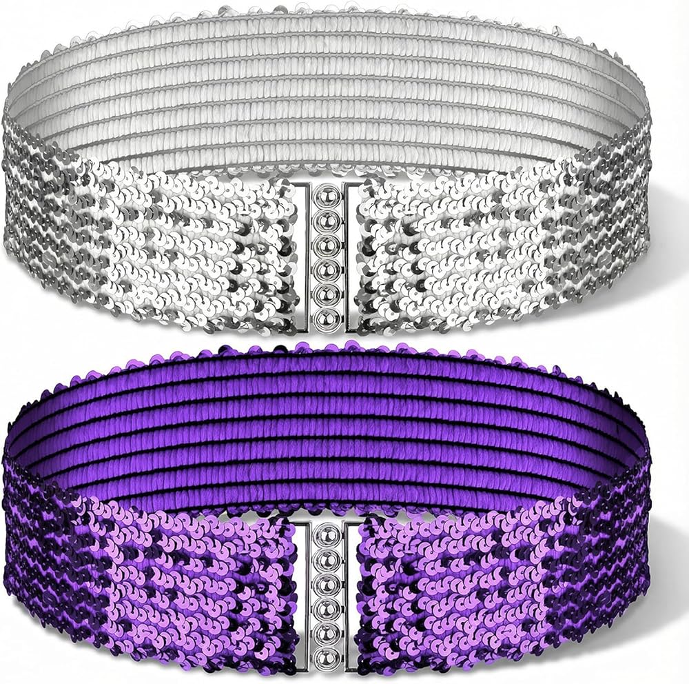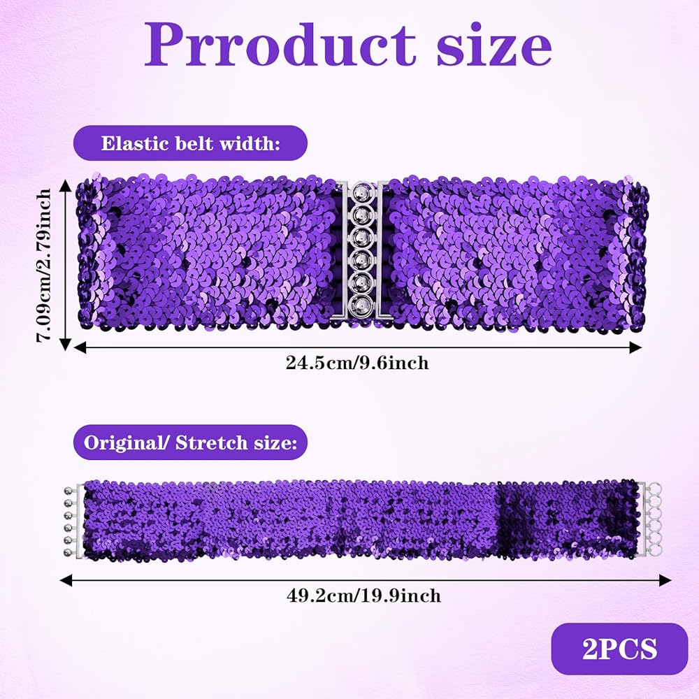 Package Contents: 2PCS Sequin Elastic Belts (Silver + Purple)