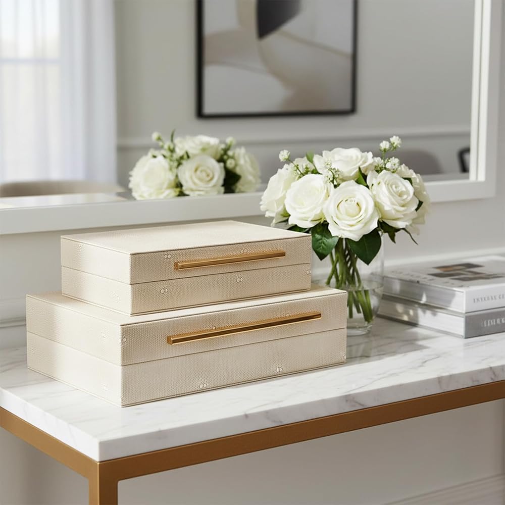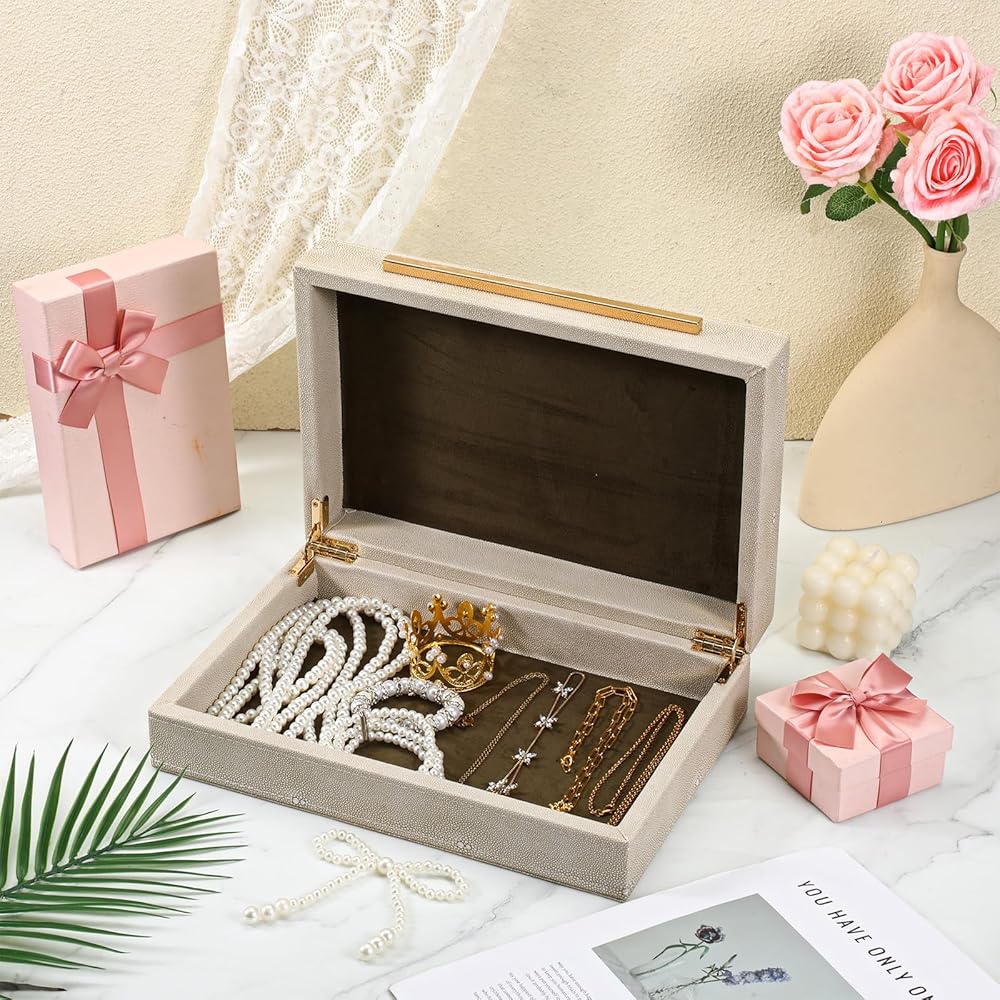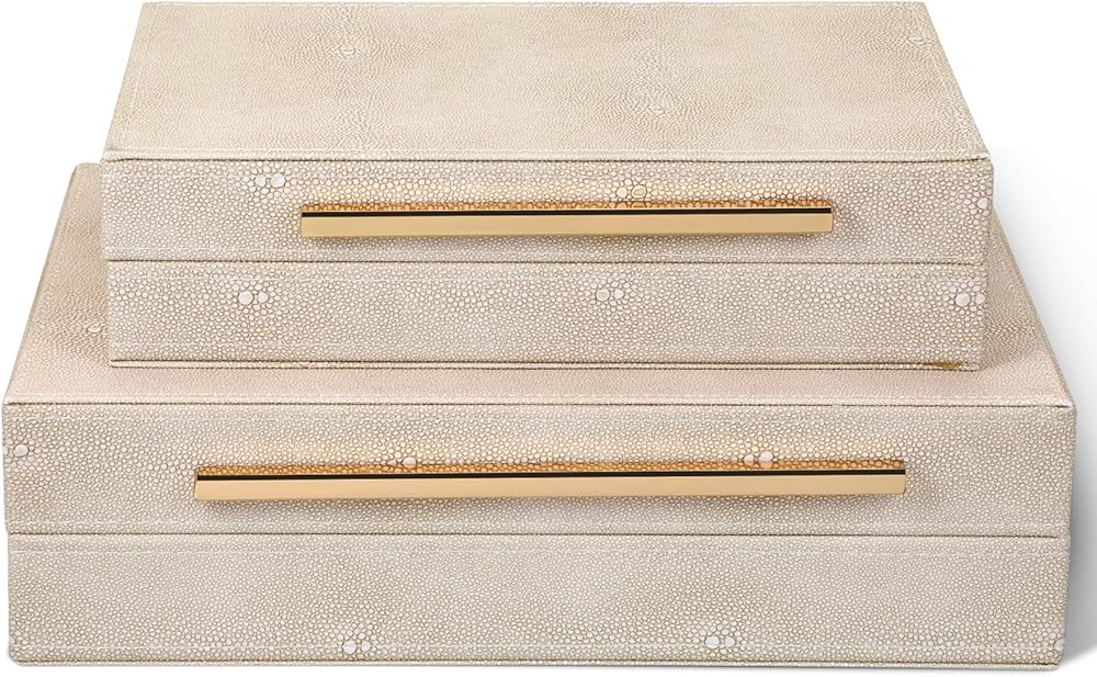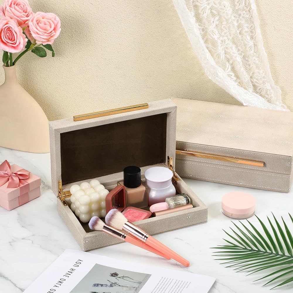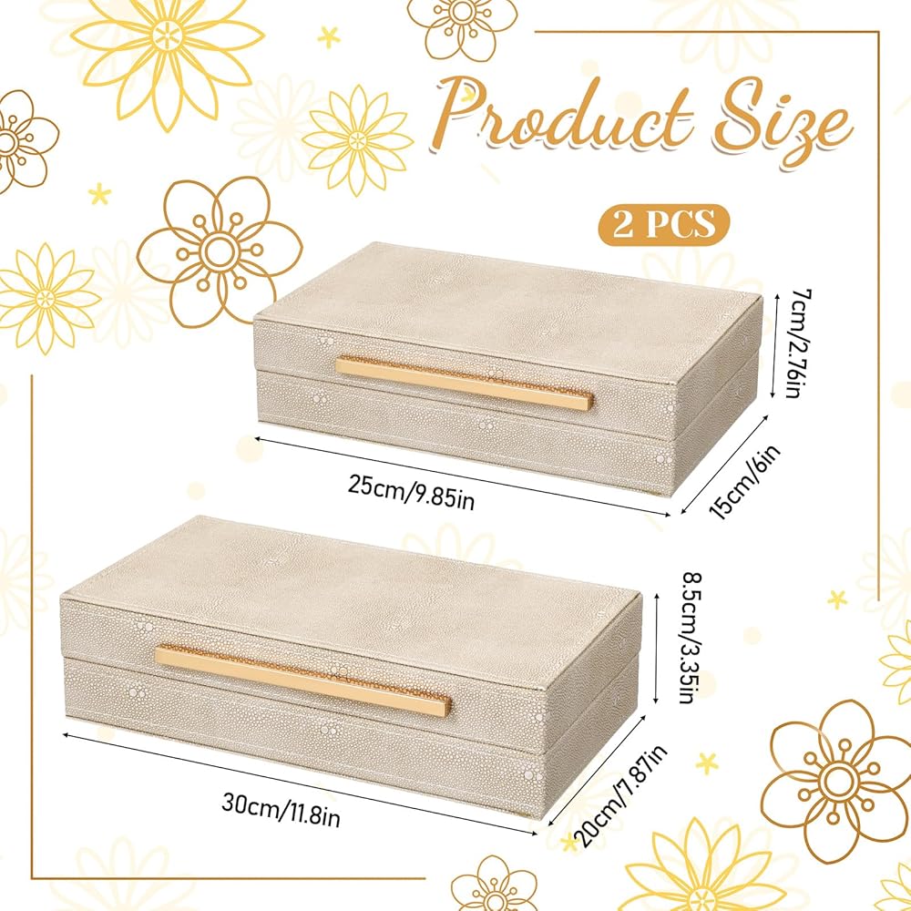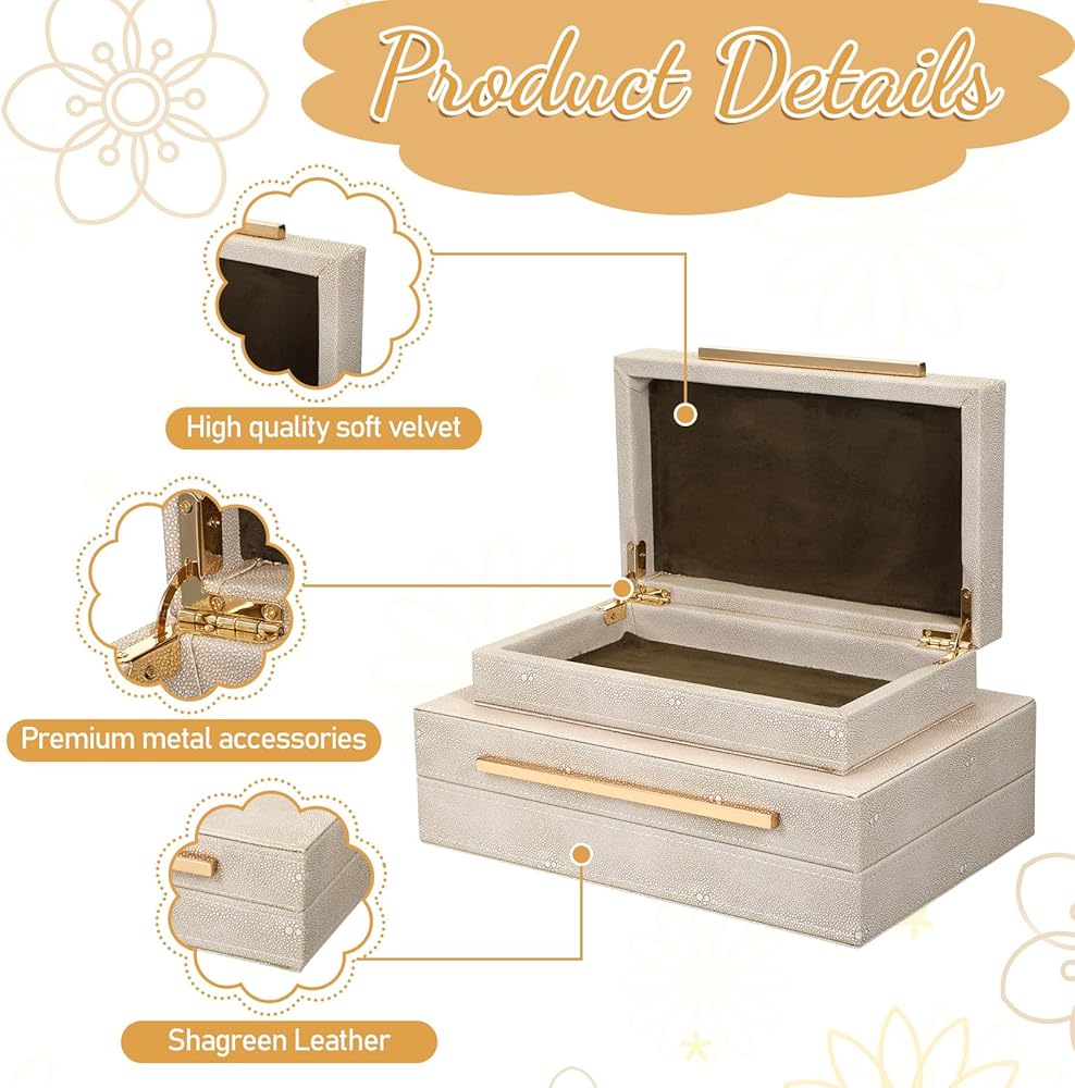 【Premium Materials】This ivory sharkskin storage box is of superior quality, with a unique texture and durable construction. Both boxes are lined with luxurious velvet, and the metal hinges open and close smoothly. The box body is made of medium-density fiberboard (MDF).