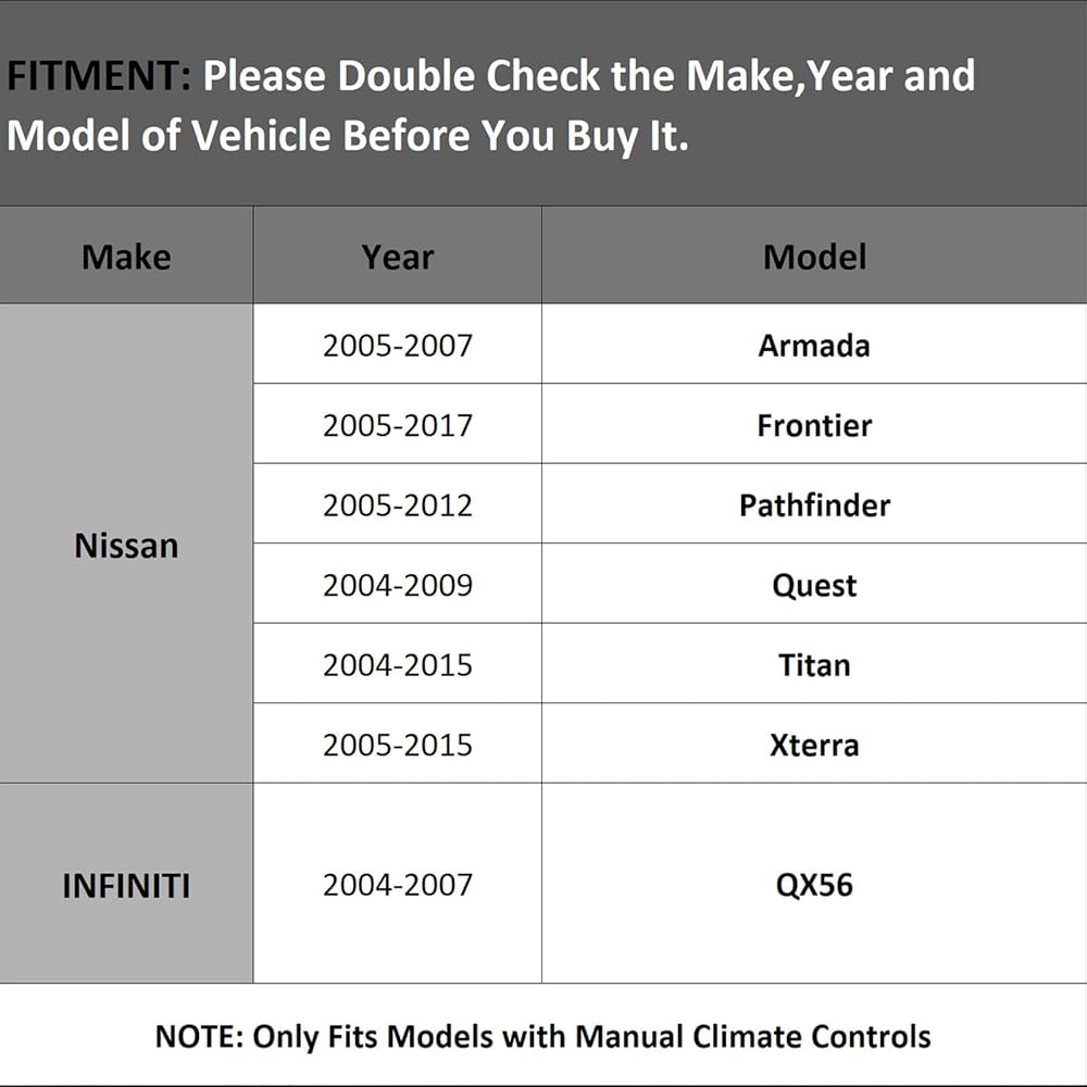• تركيب السيارة: متوافق مع 2005-2007 أرمادا، 2005-2017 فرونتير، 2005-2012 باثفايندر، 2004-2009 كويست، 2004-2015 تيتان، 2005-2015 إكستيرا. ملاحظة: يناسب فقط الطرازات التي تحتوي على أدوات تحكم يدوية في المناخ. يتم تركيبه بسهولة في محرك منفاخ التيار المتردد الخاص بك. ما عليك سوى إزالة البراغي التي تثبت مقاومة محرك المنفاخ في المنفاخ، وإزالة مجموعة المقاوم، وتثبيت المقاوم الجديد في مكانه