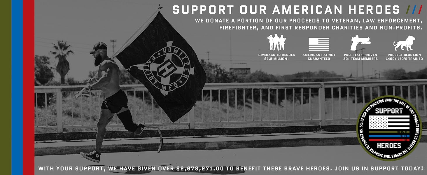 • عطاء HOWITZER الخيري - 5% من عائداتنا تعود بالنفع على الأبطال الأمريكيين الذين ضحوا لحمايتنا: انضم إلى القضية لمساعدة المحاربين القدامى والمستجيبين الأوائل. يعود جزء من كل عملية بيع إلى المؤسسات الخيرية وغير الربحية: التمنيات للمحاربين، والارتقاء فوق المشقة، والصندوق التذكاري لإنفاذ القانون الوطني، والمؤسسة الوطنية لرجال الإطفاء الذين سقطوا. باحترام وشرف وامتنان، نحن ندعم الأبطال الأمريكيين. ساعد في دعم المحاربين القدامى وضباط الشرطة ورجال الإطفاء والمستجيبين الأوائل.