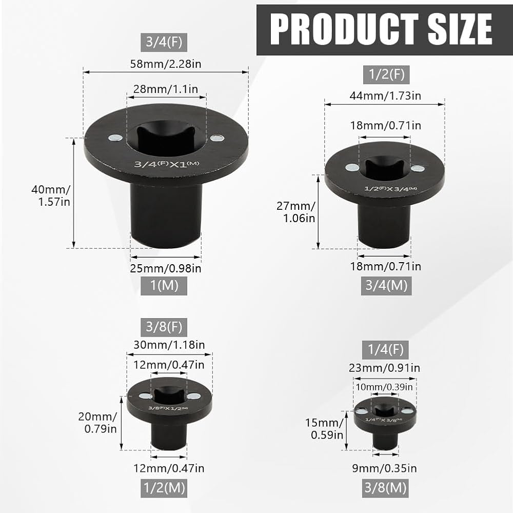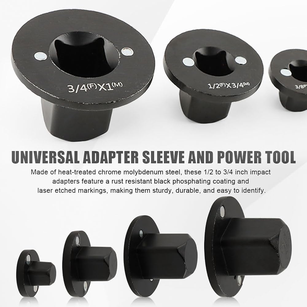 3.【Industrial grade chromium molybdenum steel material】Made of heat-treated chrome molybdenum steel, these 1/2 to 3/4 inch impact adapters feature a rus-t resistan-t black phosphating coating and etched markings, making them sturdy, durable, and easy to identify.