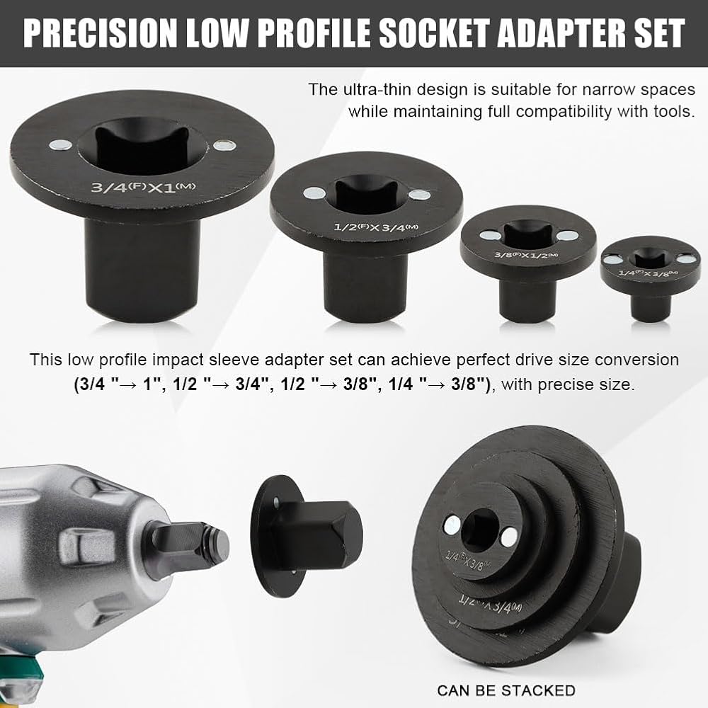 1.【Precision low profile socket adapter set】This low profile impact sleeve adapter set can achieve perfec-t drive size conversion (3/4 "→ 1", 1/2 "→ 3/4", 1/2 "→ 3/8", 1/4 "→ 3/8"), with precise size. The ultra-thin design is suitable for narrow spaces while maintaining full compatibility with tools.