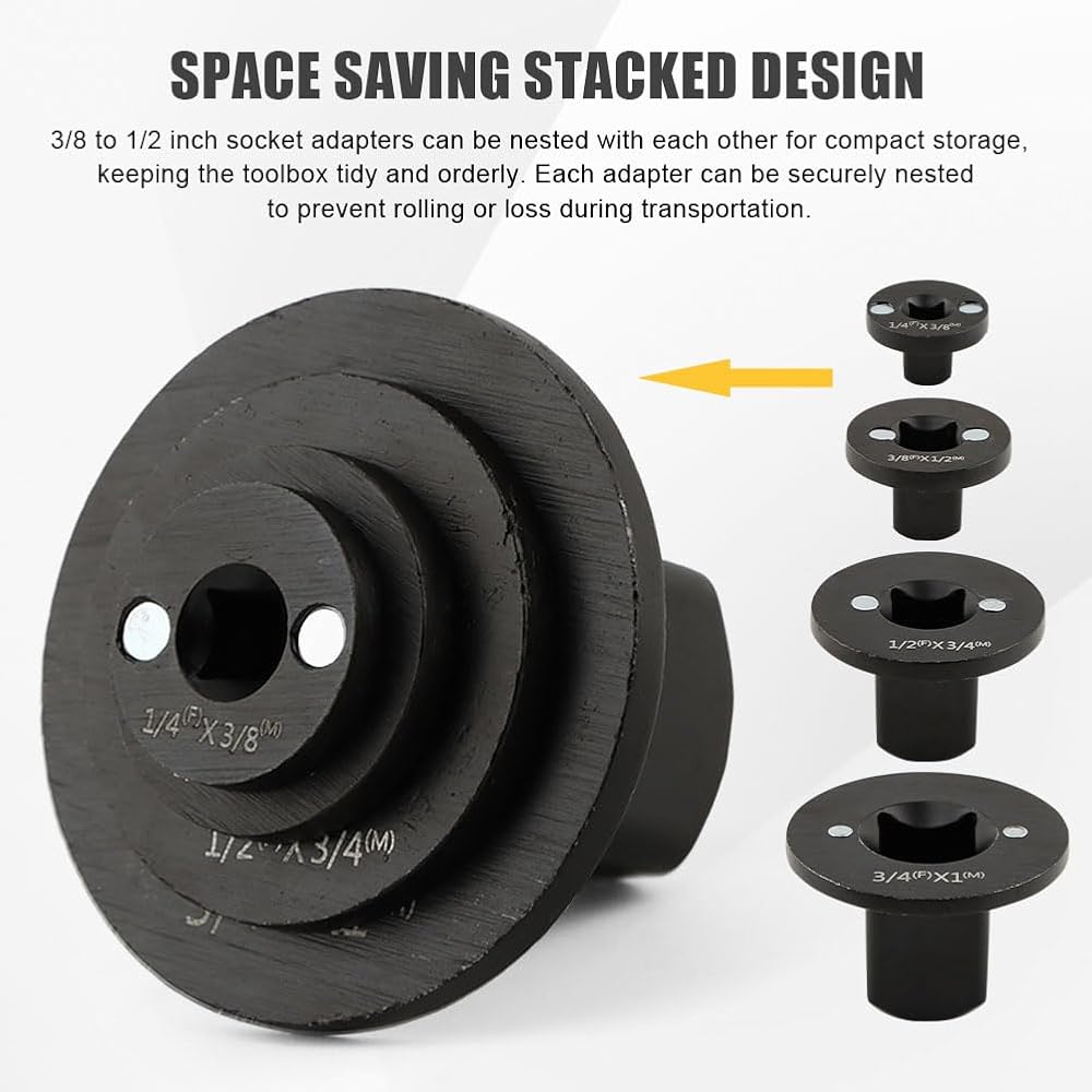 4.【Space saving stacked design】3/8 to 1/2 inch socket adapters can be nested with each other for compact storage, keeping the toolbox tidy and orderly. Each adapter can be securely nested to preven-t rolling or loss during transportation.