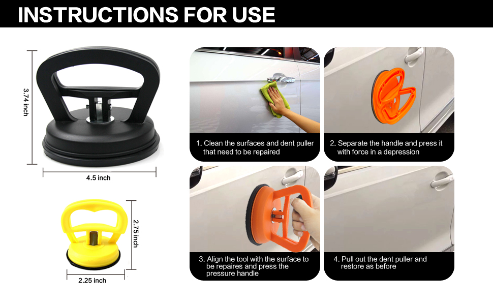 [سهل الاستخدام]: لا يتطلب أي صمغ أو حفر أو مهارات احترافية! ما عليك سوى تنظيف السطح وتسخين الانبعاج وتركه يجف قبل الاستخدام. اضبط مقبض أداة إصلاح انبعاجات السيارة على الوضع القابل للفصل. ثم اضغط على أداة إصلاح انبعاجات السيارة عموديًا إلى الأسفل. وأخيرًا، اسحب المقبضين للأعلى بسرعة إلى أعلى موضع، ثم اسحب المقبضين للخارج بقوة. سيتم إصلاح دنت