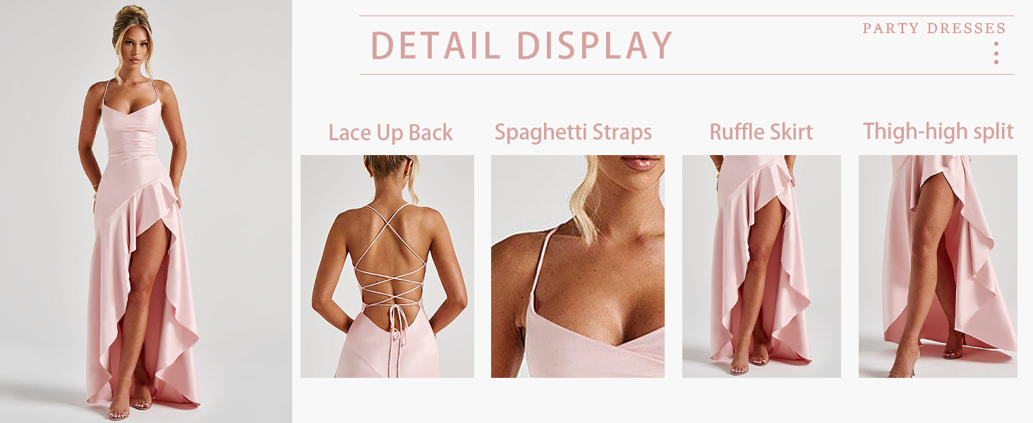 Sleek Satin Fabric & Flattering Silhouette:Crafted from smooth, lustrous satin; features a form-fitting bodice + high-low ruffled skirt with a thigh-high slit for a glamorous, red-carpet-ready look. Eye-catching crisscross lace-up open back with adjustable ties; delicate spaghetti straps add elegance while ensuring a secure fit. A standout detail that balances allure and sophistication.. Perfect for prom, weddings, or formal galas.