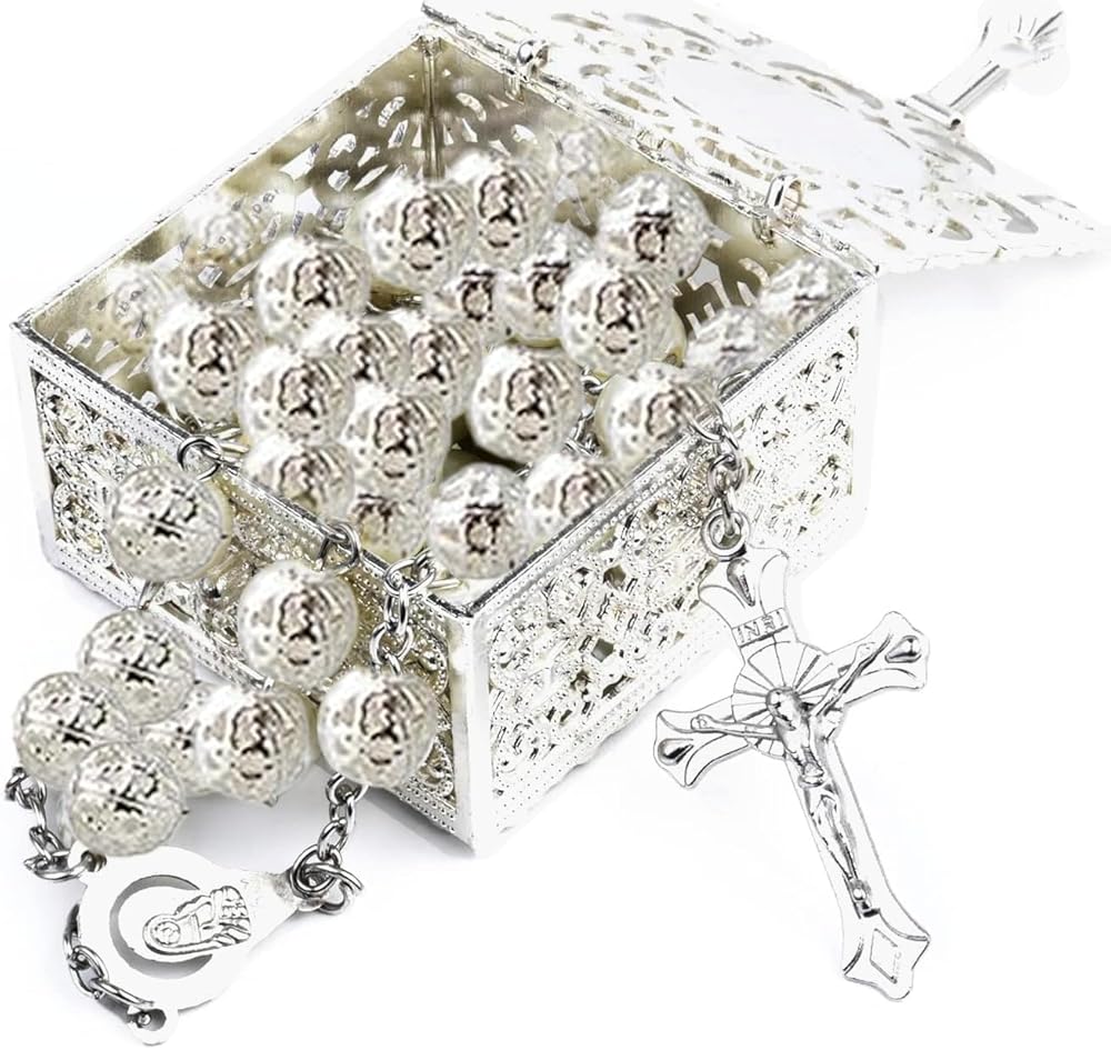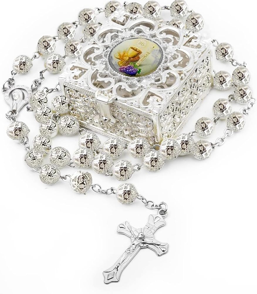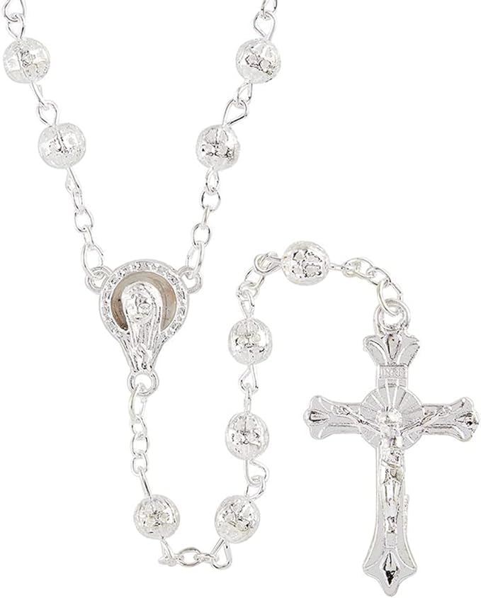 UNIQUE COMMUNION SILVER ROSARY: This beautiful and classic rosary necklace features 5 mm textured Silver Beads with a Blessed Mother centerpiece and a Traditional Crucifix. The silver metal beads are crafted with a open metal filigree technique making them not only very unique but also lightweight.