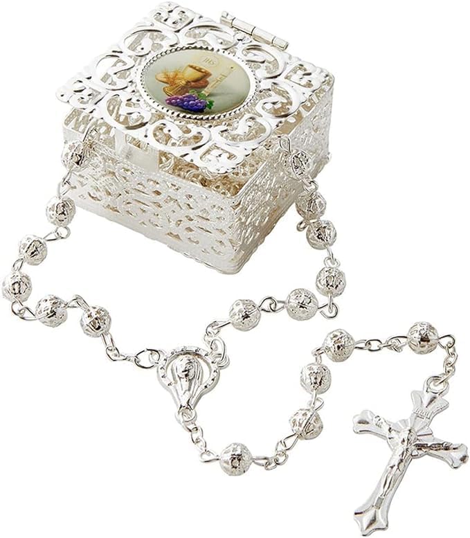 Delight in the sacred tradition of First Communion with our exquisite Rosary Box Gift Set. This set includes a stunning Silver Metal Filigree Hinged Rosary Box adorned with a delicate Chalice and Host design, symbolizing the solemnity of the sacrament. The box provides a cherished space to store a treasured rosary, keeping it safe and secure for years to come. Accompanying the box is a beautiful Silver Beads Rosary Necklace, meticulously crafted with intricate detailing. Each bead serves as a reminder of the prayers offered during the communion ceremony, creating a meaningful connection to the divine. Whether presented as a gift for a loved one or cherished as a personal keepsake, this Rosary Box Gift Set is a timeless symbol of faith and devotion. Celebrate the sacred journey of First Communion with this elegant and thoughtful gift