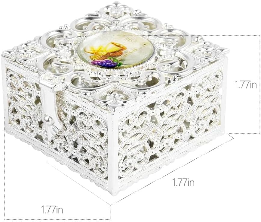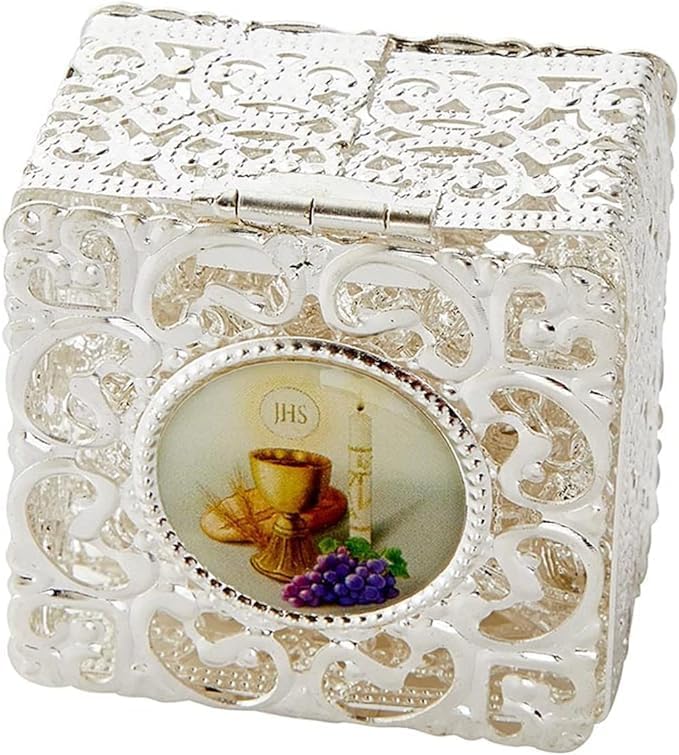 EXQUISITE ROSARY BOX with a delicate Filigree lace like open pattern ornate design in Silver Metal with a delicate Chalice and Host Color epoxy Center Medal this Square Hinged Rosary Box provides a cherished space to store a treasured rosary, keeping it safe and protected for years to come.