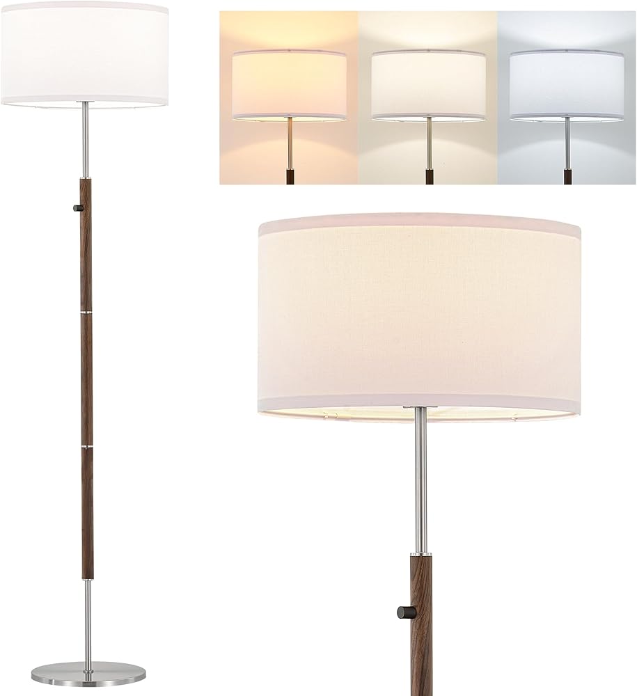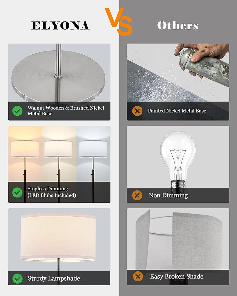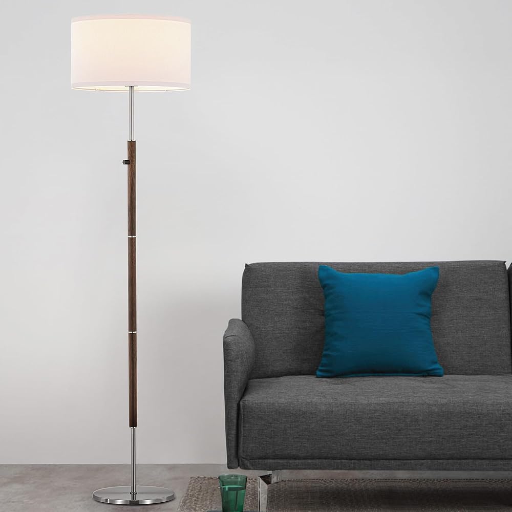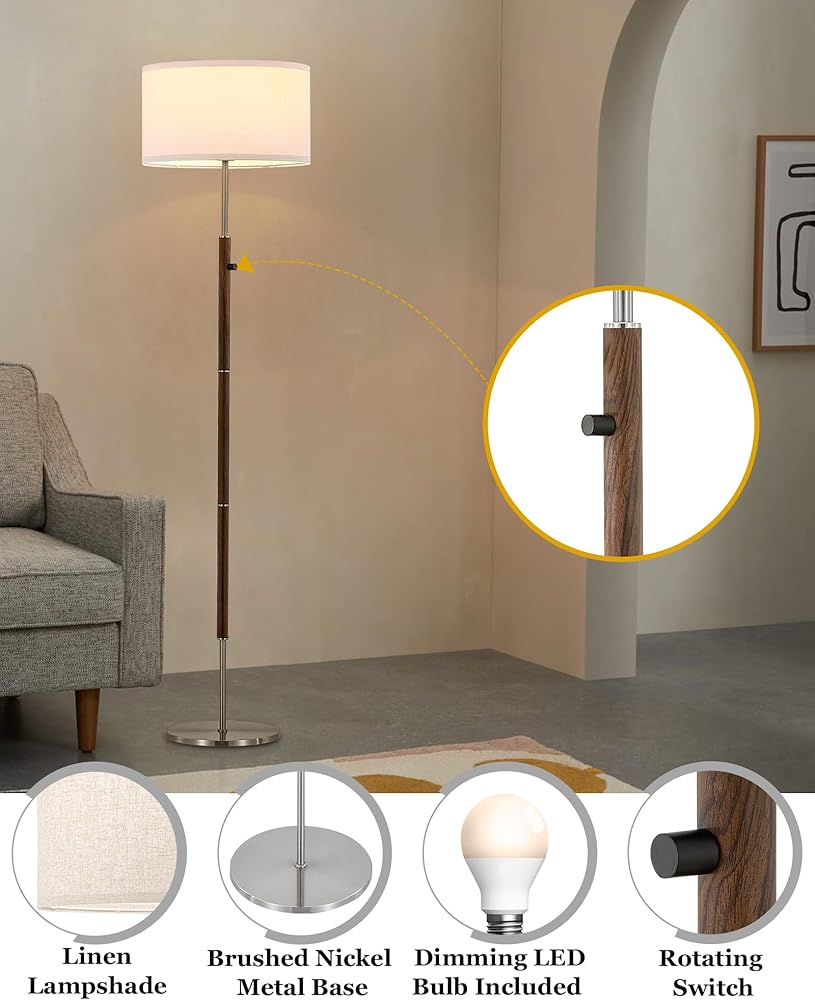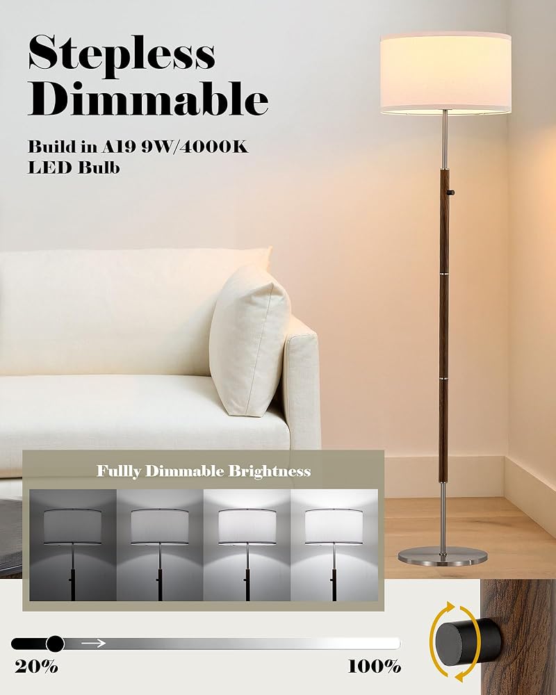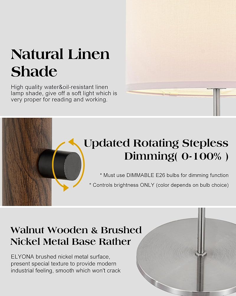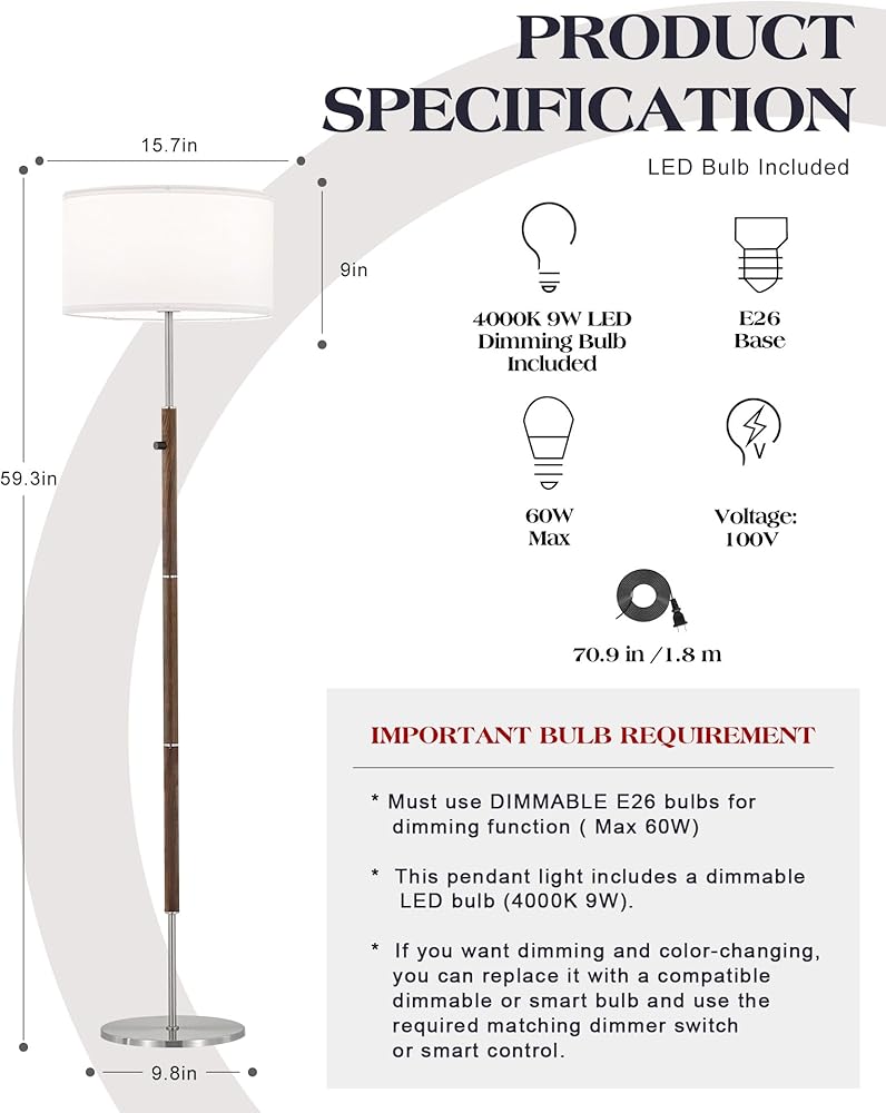 Elevate Your Interior with ELYONA's Sophisticated Walnut & Metal Fusion Floor Lamp. Are you searching for a floor lamp that balances timeless retro charm with modern functionality? The ELYONA Dimmable Pole Lamp is designed to be the focal point of your modern home, blending the organic beauty of walnut wood with the industrial elegance of brushed nickel. Tactile Control for Every Mood Whether you need bright illumination for focused tasks in your office or a soft, warm glow for a movie night in the living room, our integrated rotary knob makes it easy. The included 4000K LED bulb offers a natural white light that mimics daylight, enhancing the true colors of your furniture and decor without flickering. Safety Meets Timeless Design Unlike flimsy alternatives, our lamp features a thickened metal pole and a heavy-duty 11.02" base for maximum stability. The water transfer finish is durable, scratch-resistant, and easy to maintain, ensuring your lamp looks brand new for years. Its classic silhouette fits seamlessly next to a sofa, armchair, or bedside. Technical Specifications (Inches): Total Height: 63.70 Inches Base Diameter: 11.02 Inches Shade Dimensions: 15.75" Diameter x 9.06" Height Switch Type: Rotary Stepless Dimmer Bulb Compatibility: E26 Base, Max 60W (Dimmable Bulb Only)