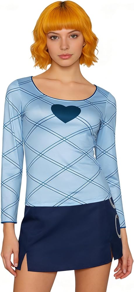 Features: Womens Nami Costume featured with light blue long sleeve top highlighted by a dark blue criss-crossing pattern and heart, hight waist a-line skirt features built-in shorts with side slit and iconic patterns design, 2 piece set perfect for anime fans or tv fans