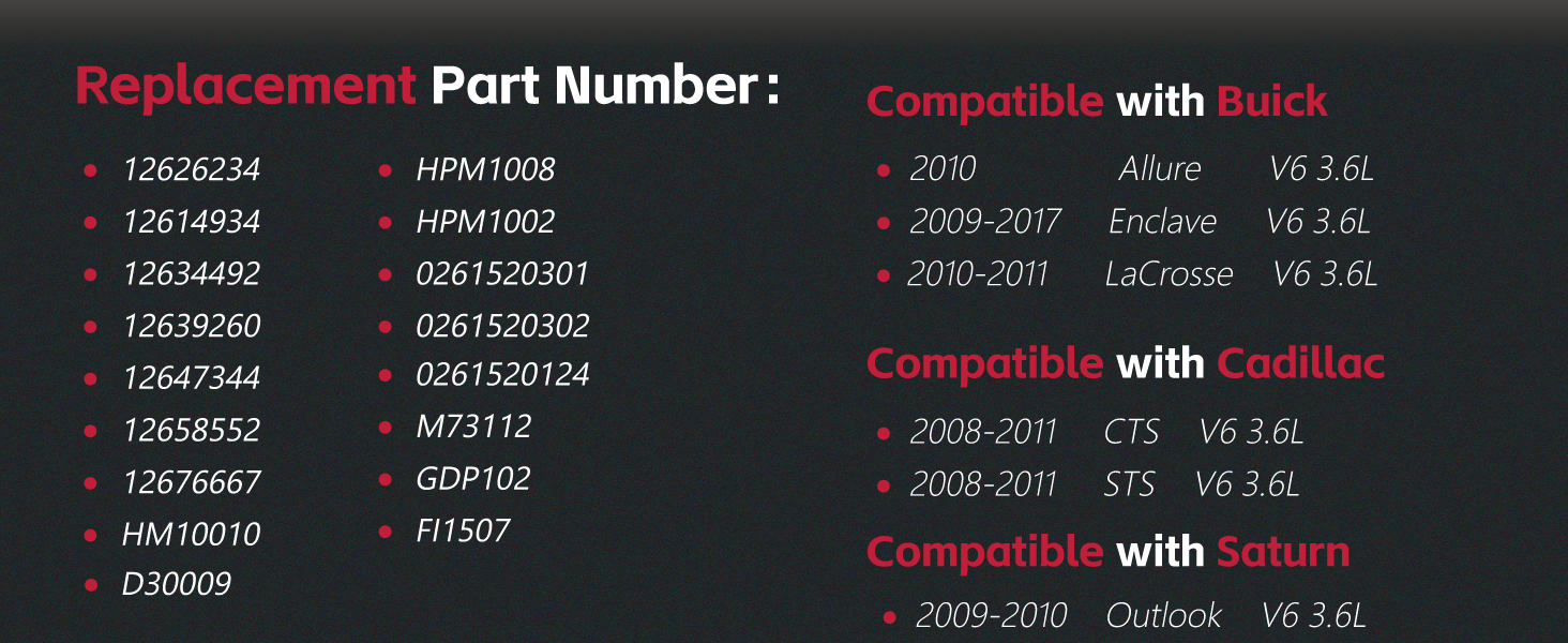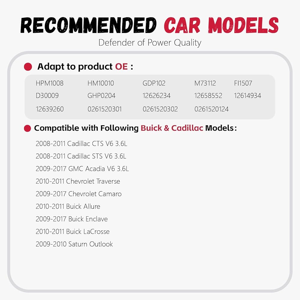 • 【نماذج المركبات المتوافقة】متوافقة مع Buick Allure 2010 V6 3.6L، Enclave 2009-2017 V6 3.6L، LaCrosse 2010-2011 V6 3.6L؛ متوافق مع كاديلاك CTS 2008-2011 V6 3.6L(2008-2009 كاديلاك CTS) تناسب فين: الخامس)