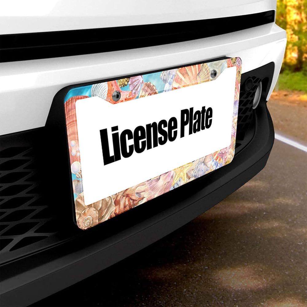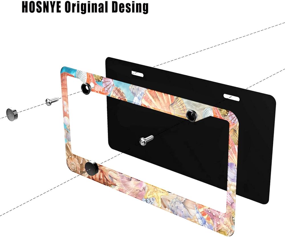 HOSNYE Ocean Sea Shells إطار لوحة ترخيص الشاطئ، خلفية صيفية، غطاء لوحة ترخيص معدني، إطارات أمامية، إطار علامة السيارة للنساء والرجال، مركبات أمريكية قياسية