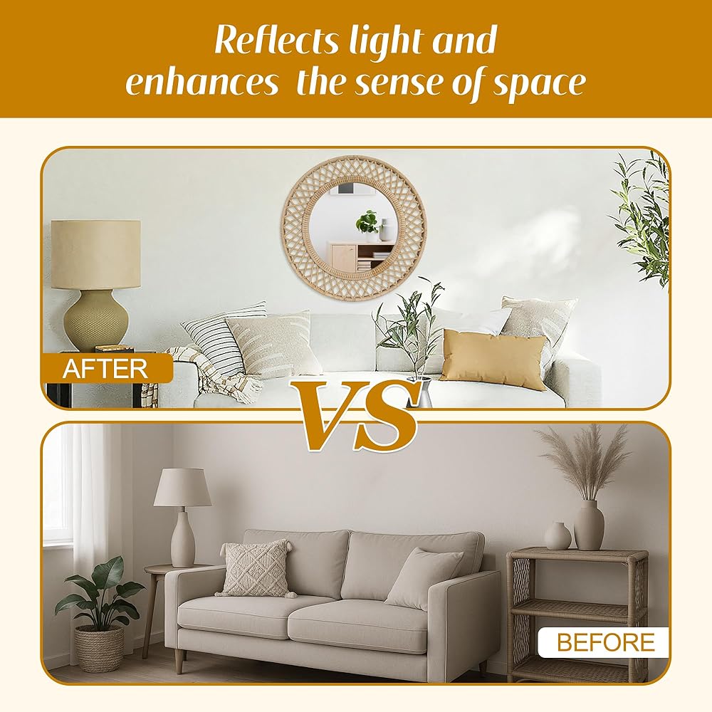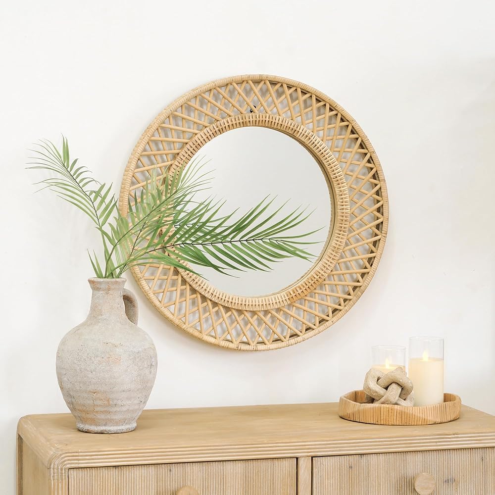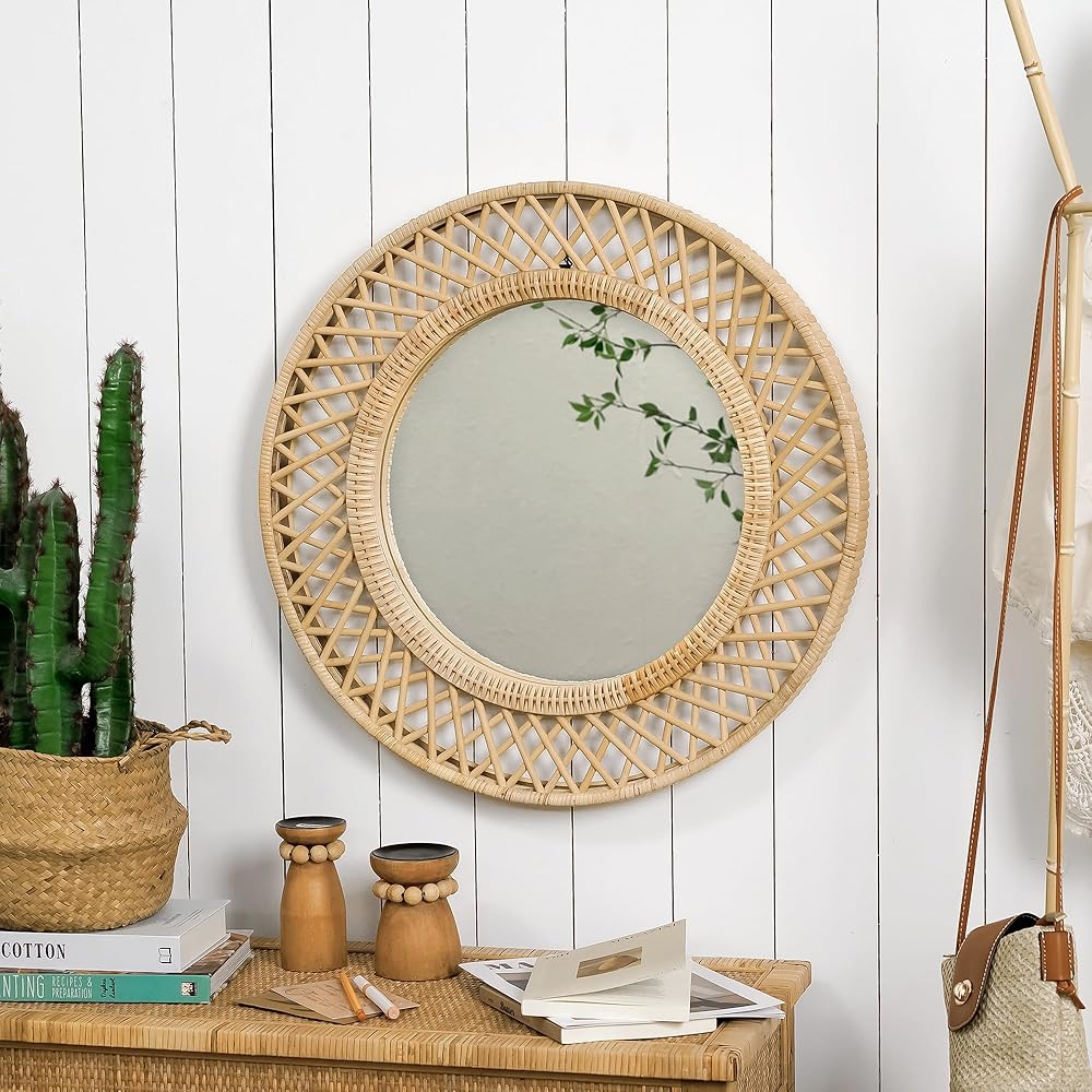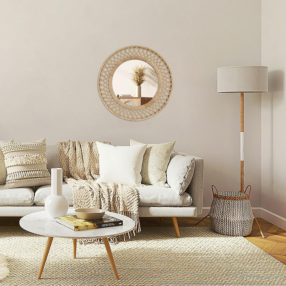 انعكاس الحب في ضوء الشمس - تتوهج هذه المرآة المستديرة مثل شروق الشمس اللطيف، حيث يجسد إطارها المصنوع من الخيزران المنسوج الدفء والرومانسية المفعمة بالحيوية للحياة البوهيمية.