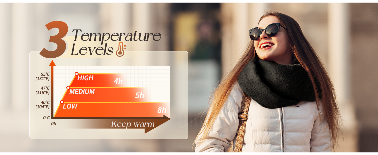 • 3 مستويات للتحكم في درجات الحرارة: بعد التسخين، يحتوي الوشاح على ثلاث درجات حرارة: درجة حرارة منخفضة (106-109 درجة فهرنهايت/41-43 درجة مئوية) يمكن أن تحتفظ بالحرارة لمدة 8 ساعات، ودرجة الحرارة المتوسطة (113-122 درجة فهرنهايت/45-50 درجة مئوية) يمكن أن توفر الحرارة لمدة 6 ساعات. يمكن أن تستمر درجات الحرارة القصوى (131 درجة فهرنهايت / 55 درجة مئوية) لمدة تصل إلى 4 ساعات من الدفء. يمكنك ضبط درجة الحرارة والوضع وفقًا لاحتياجاتك للحفاظ على الجزء الخلفي من رقبتك دافئًا ومريحًا.