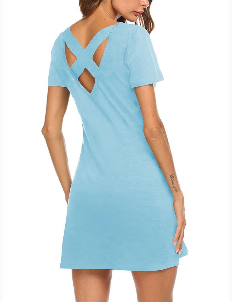 Tee shirt dresses for women causal short sleeve mini dresses for women summer Gender: Women Waistline: Natural Neckline: Round Neck Season:Summer Feature: Round Neck, short sleeve, mini dresses, criss cross back. Pattern Type: Floral dresses,solid dresses and striped dresses his vibrant short dress is such a delightful choice for any summer day! We love the classic floral paired with the summer days - it's such an effortlessly cute look. This short sleeve dresses also has the criss cross back detail. It's so perfect for warm summer afternoons. . Model is wearing a small.