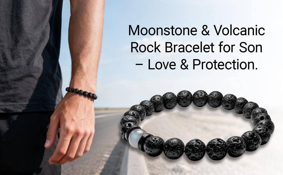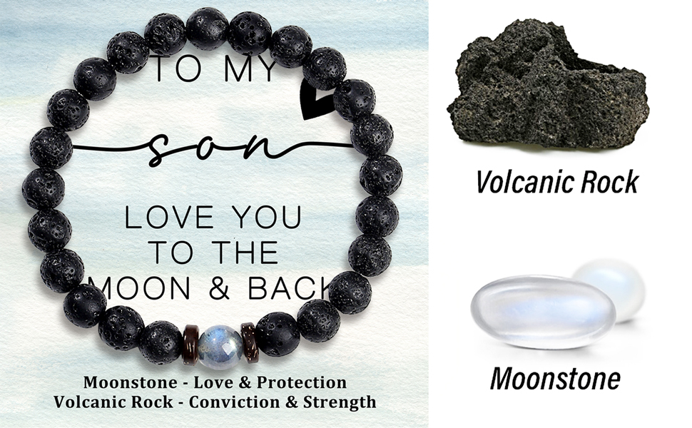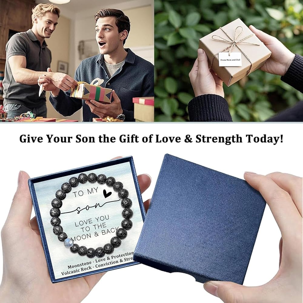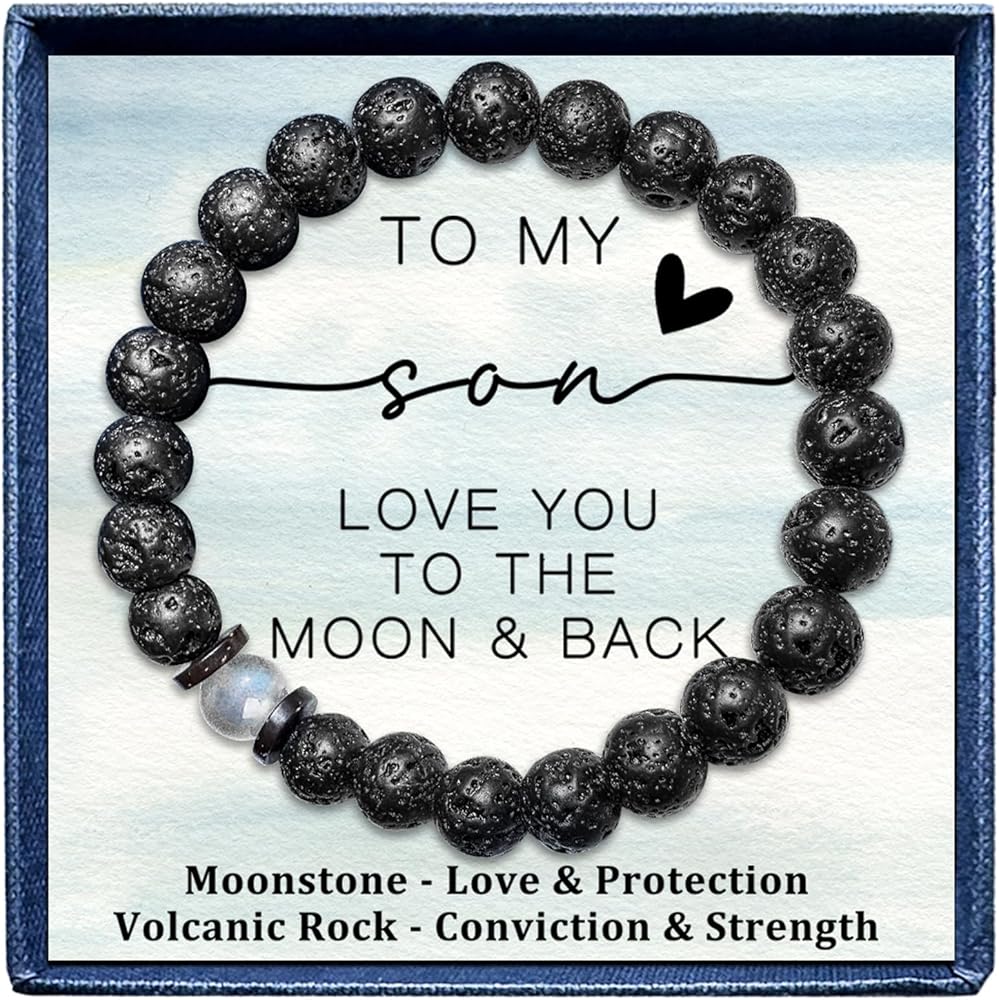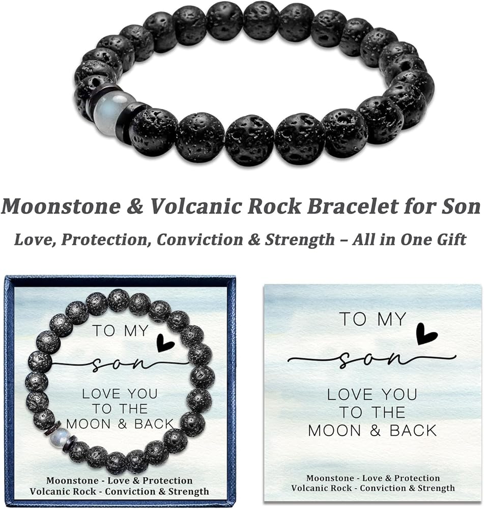هدية للابن من الأم والأب - سوار من الحجر الطبيعي للأولاد المراهقين، سوار ابن ذو مغزى مع صخرة الحمم البركانية من حجر القمر، هدية عيد ميلاد التخرج وعيد الفصح للأولاد المراهقين والرجال