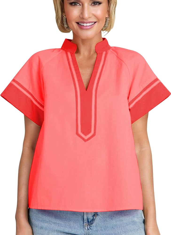 • بلوزة متعددة الاستخدامات للنساء كاجوال أنيقة، مقاس مريح، يمكنك ارتداء هذا القميص القطني قصير الأكمام مع مجموعة متنوعة من الجينز والسراويل القصيرة والتنانير للحصول على مظهر كاجوال مثالي للصيف