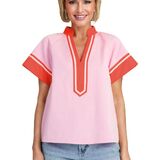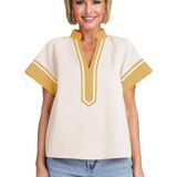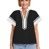 • تي شيرت صيفي أنيق بأكمام قصيرة مرقع للنساء مع مخطط على الأساور والرقبة، تصميم مطوي على الظهر، مناسب للارتداء الكاجوال والعمل والمكتب والمدرسة والعمل والتسوق وملابس الصالة