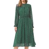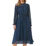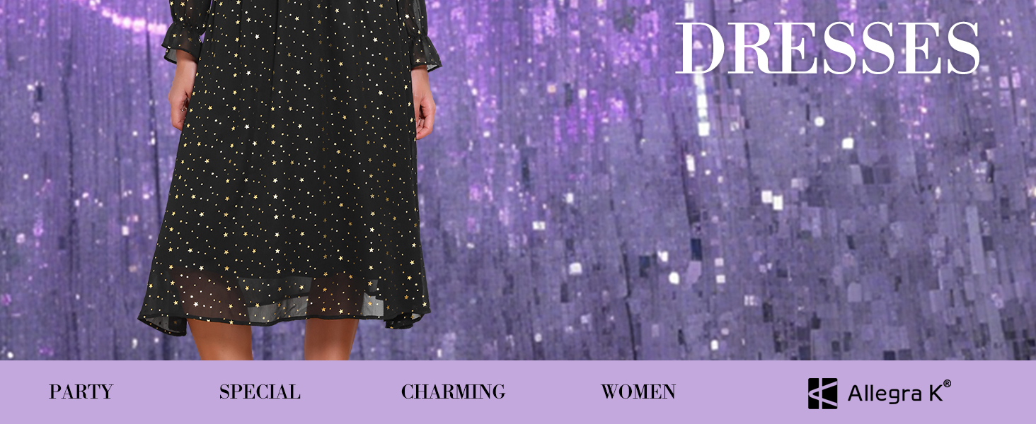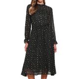 مميزات التصميم: تتميز الفساتين الكاجوال للنساء بطباعة نجوم معدنية لامعة، ورقبة عالية مكشكشة، وأكمام طويلة شفافة، ومبطنة، وخصر مرن مدخن، وطول أسفل الركبة، وخط على شكل حرف A، وفتحة خلفية، وحاشية متأرجحة بطبقات. من السهل ارتداؤه وخلعه