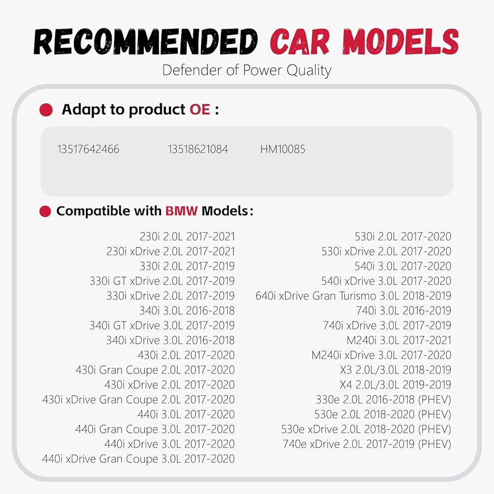 【نماذج المركبات المتوافقة】متوافقة مع BMW 530i 2017-2020 2.0L، 530i xDrive 2017-2020 2.0L، 540i 2017-2020 3.0L، 540i xDrive 2017-2020 3.0L، 640i xDrive Gran Turismo 2018-2019 3.0L، 740i 2016-2019 3.0L، 740i xDrive 2017-2019 3.0L، M240i 2017-2021 3.0L، M240i xDrive 2017-2020 3.0L، X3 2018-2019 2.0L/3.0L, X4 2019 2.0L/3.0L---GAS,330e 2016-2018 2.0L, 530e 2018-2020 2.0L, 530e xDrive 2018-2020 2.0L, 740e xDrive 2017-2019 2.0 لتر --- PHEV