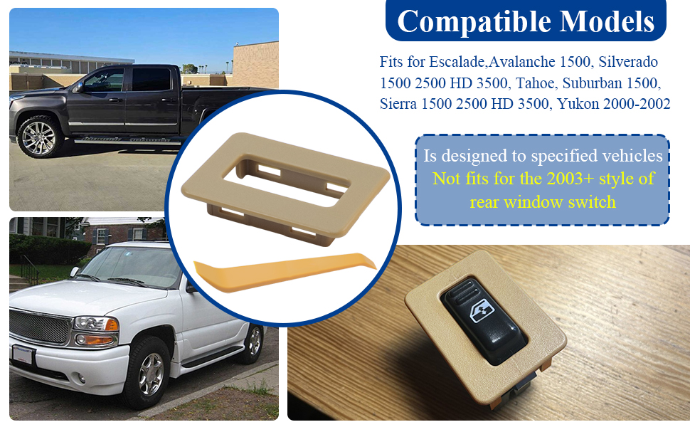 • الطرز المتوافقة: تم تصميم غطاء زر إصلاح النوافذ لمركبات محددة، يناسب Escalade، Avalanche 1500، Silverado 1500 2500 HD 3500، Tahoe، Suburban 1500، Sierra 1500 2500 HD 3500، Yukon 2000-2002، لا يناسب طراز 2003+ لمفتاح النافذة الخلفية