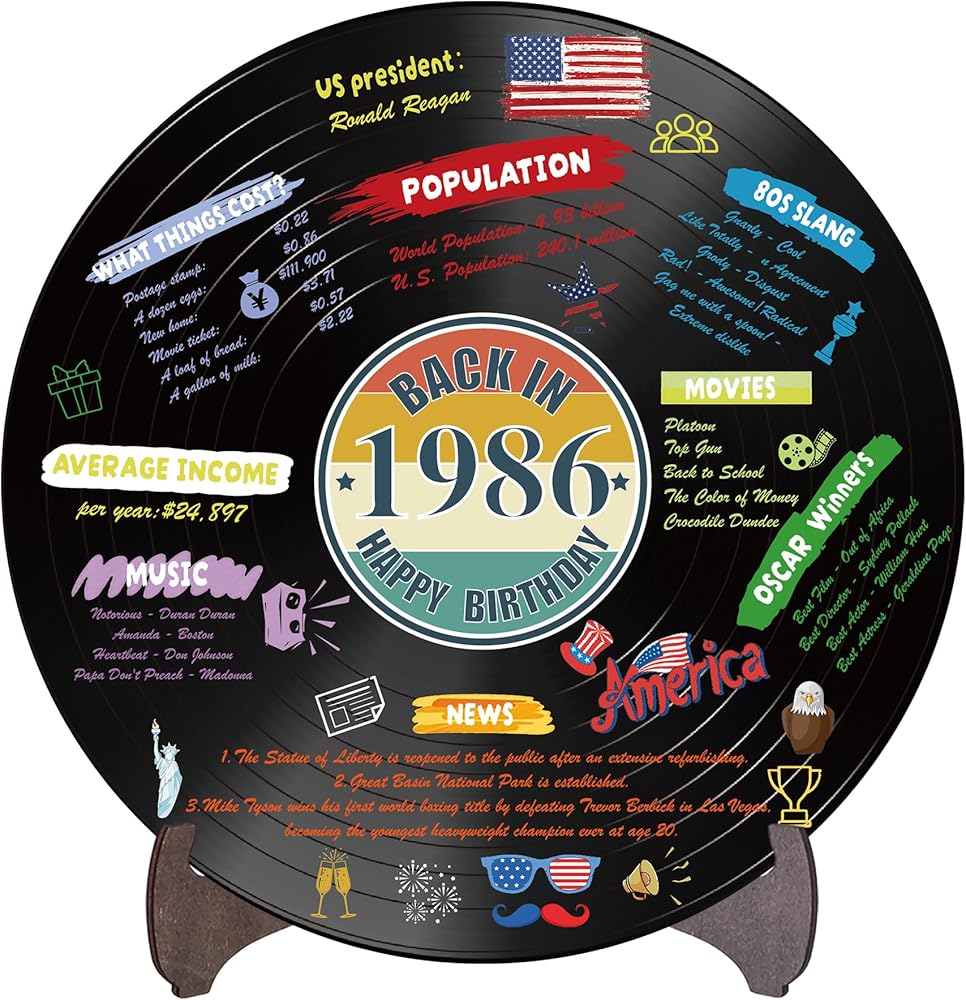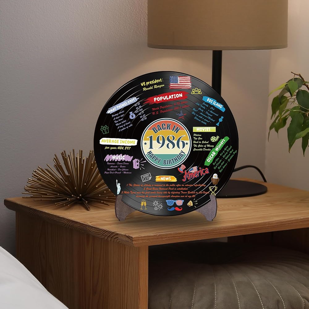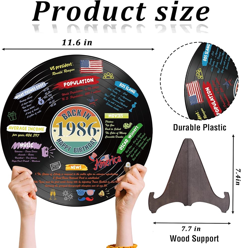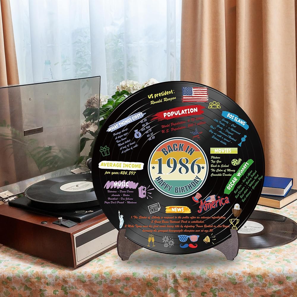 Holkcog الفينيل سجل 1986 زخرفة عيد ميلاد، خمر مرة أخرى في عام 1986 ملصق حفلة عيد ميلاد مع حامل، 40 سنة لوازم الحفلات للرجال والنساء، هدايا لم شمل فئة الذكرى الأربعين