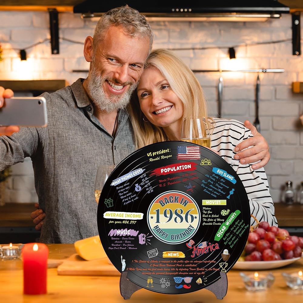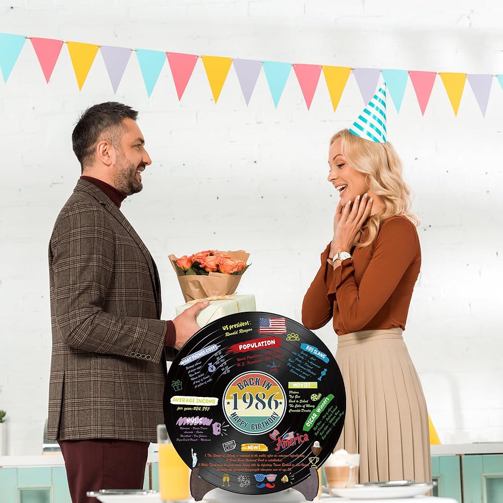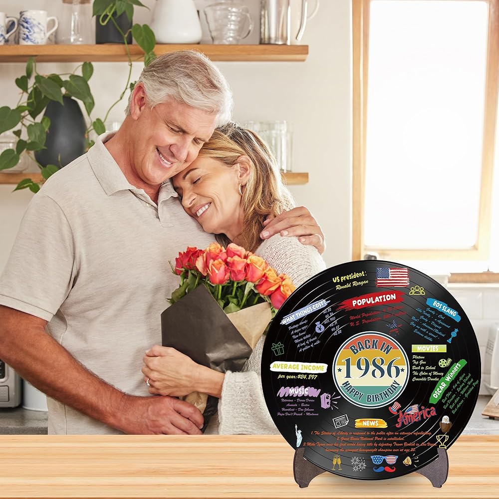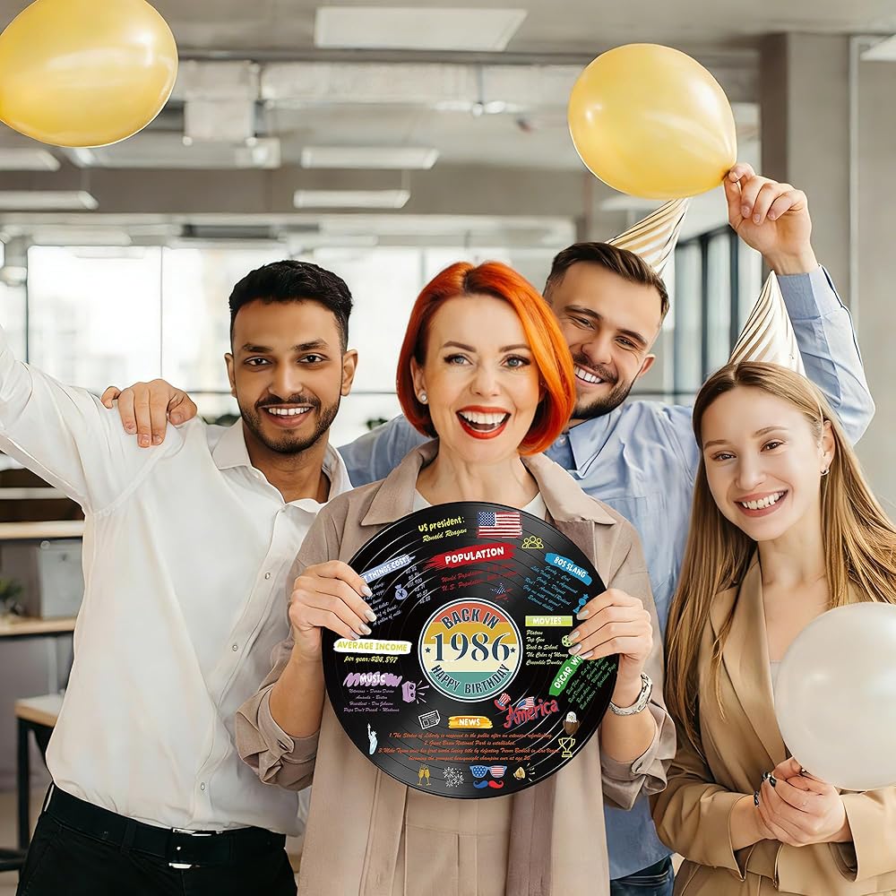 Holkcog الفينيل سجل 1986 زخرفة عيد ميلاد، خمر مرة أخرى في عام 1986 ملصق حفلة عيد ميلاد مع حامل، 40 سنة لوازم الحفلات للرجال والنساء، هدايا لم شمل فئة الذكرى الأربعين